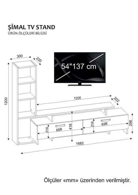 - Rozměry TV skříňky: Šířka: 168,2 cm, Výška: 120 cm, Hloubka: