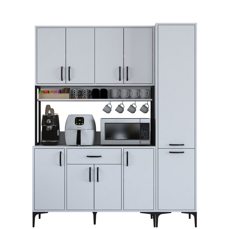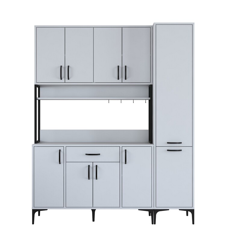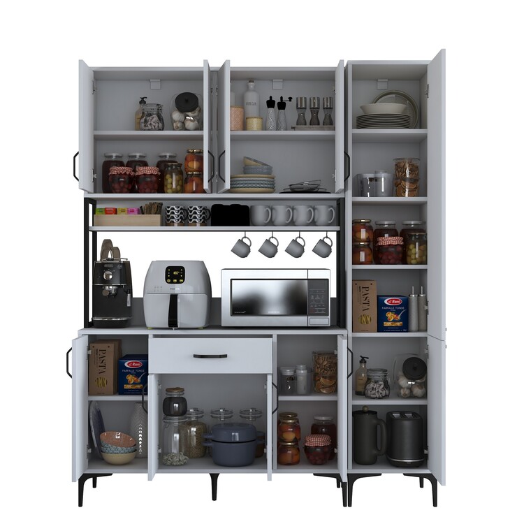 Skříň poskytuje bohatý úložný prostor díky 10 plným dvířkům, jedné zásuvce a praktickému regálku. Tento víceúčelový design umožňuje snadné uspořádání kuchyňských potřeb, nádobí a dalších předmětů, které chcete mít přehledně uložené a snadno dostupné.