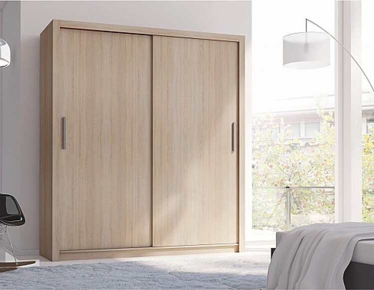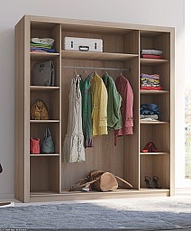 Skříň MISTERY o šířce 180 cm je praktickým řešením pro ložnicenebo obývací pokoje. Tento model má dvoudveřový systém s posuvnýmidveřmi, které šetří místo a usnadňují přístup k obsahu. Skříňobsahuje policovou část po stranách, ideální pro uložení bot, tašek nebosezónního oblečení. Uprostřed skříně je umístěna šatní tyč prozavěšení košil, šatů nebo kabátů.