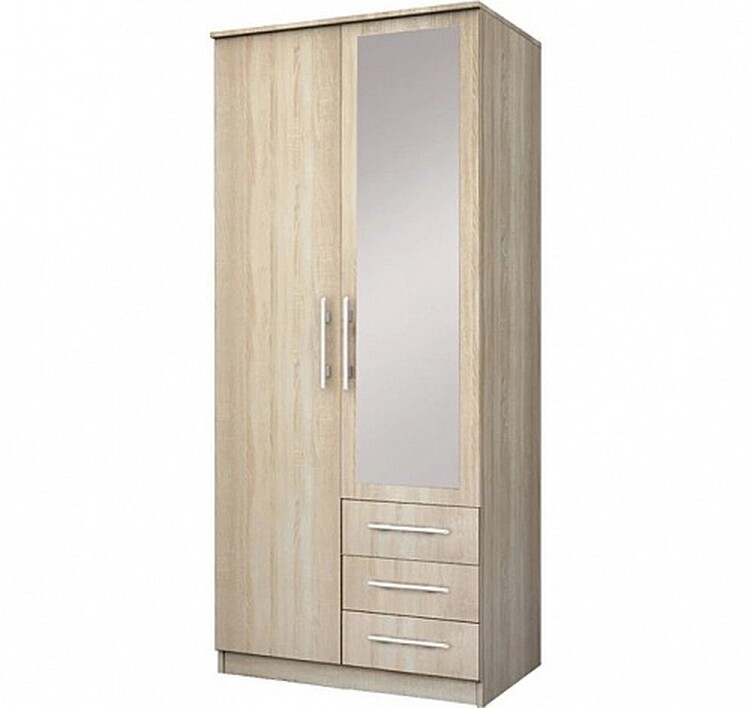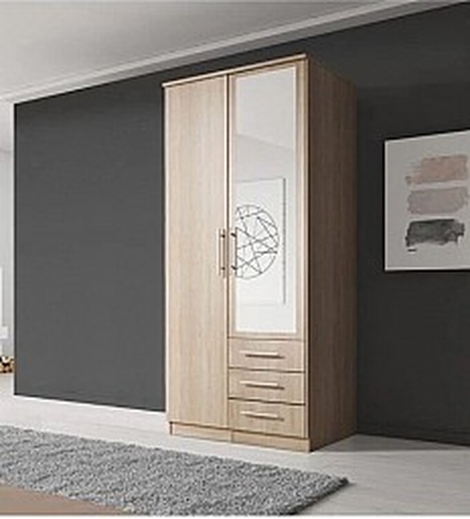 Skříň SANZIA 2D o šířce 100 cm je ideální volbou pro ložnicei předsíně. Skříň je vybavena dvěma dveřmi, přičemž na jednomz nich se nachází praktické zrcadlo. V dolní části skříně jsouumístěny tři zásuvky, ideální pro uložení drobností, spodního prádlanebo doplňků.