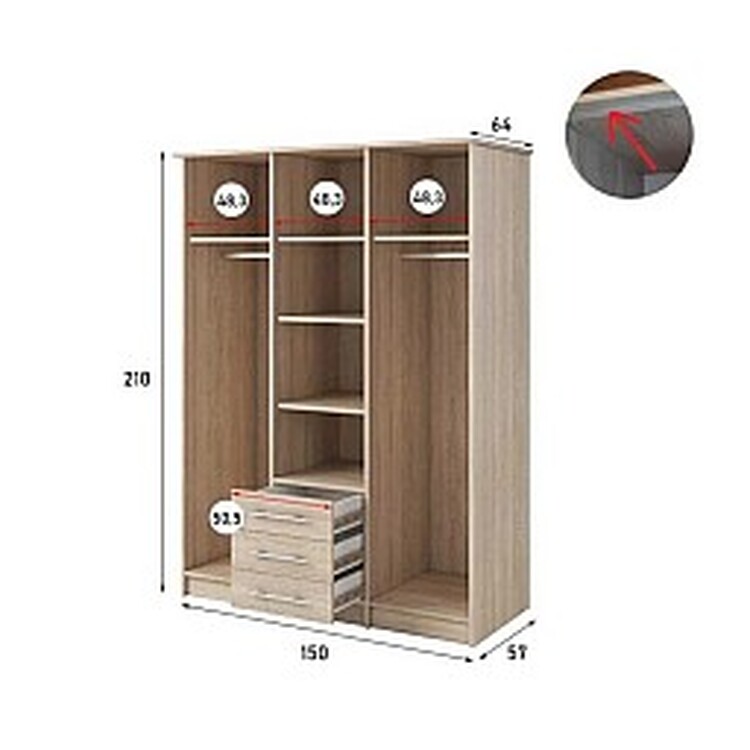 Vnitřní uspořádání skříně zahrnuje levé a pravé částis policemi a šatní tyčí pro zavěšení oděvů, a střední část, kteráobsahuje police a 3 zásuvky pro drobnosti. Skříň je vyrobena z laminovanédřevotřísky (LTD) o tloušťce 16 mm, což jí zajišťuje dlouhouživotnost a odolnost proti poškrábání, vlhkosti a vysokým teplotám. Hranyskříně jsou chráněny ABS lištami pro zvýšenou odolnost, a zadní stěnaje vyrobena ze sololitové desky.