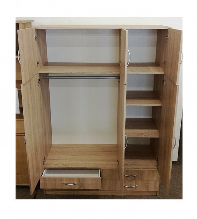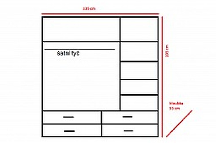 Skříň je také vybavena čtyřmi zásuvkami v dolní části, které jsouideální pro ponožky nebo věci, které děti potřebují mít po ruce.Skříň je vyrobena z kvalitního lamina o tloušťce 16 mm a jek dispozici v tradičním provedení v dubové nebo bukové barvě.S rozměry 135 cm na šířku, 195 cm na výšku a 55 cm na hloubku jeideální pro většinu místností.