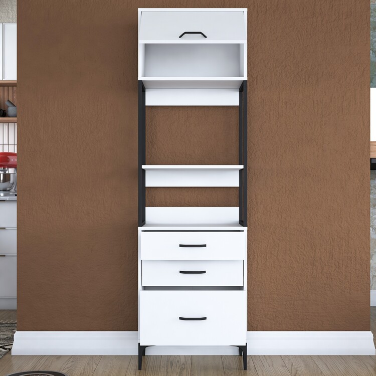 Skříň nabízí kombinaci úložných prostor v podobě jedněch plných dvířek, tří prostorných zásuvek a praktického regálku, který je ideální pro vystavení nebo snadný přístup k často používaným předmětům. Díky své výšce je skříň vhodná i do menších koupelen, kde pomáhá maximálně využít dostupný prostor.