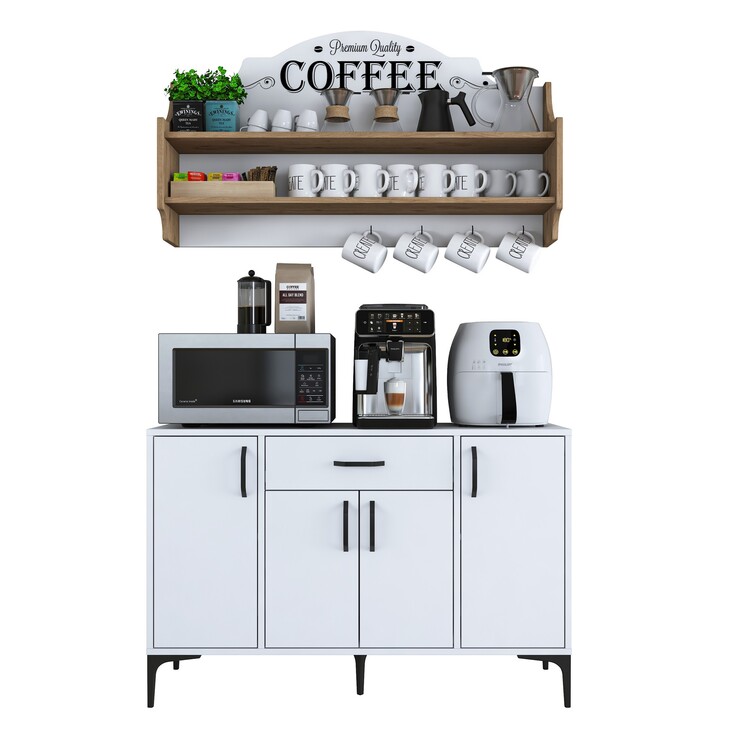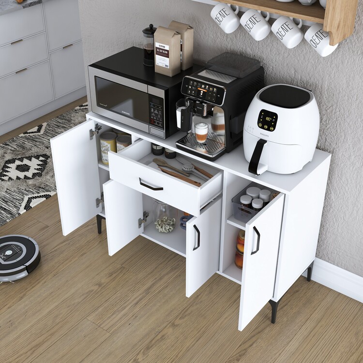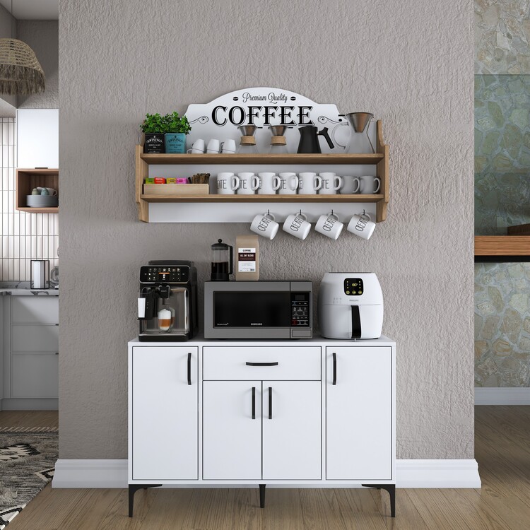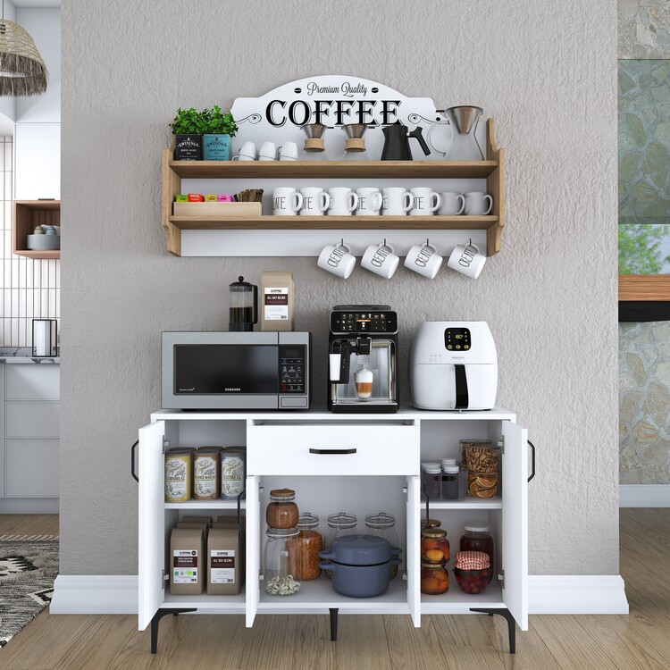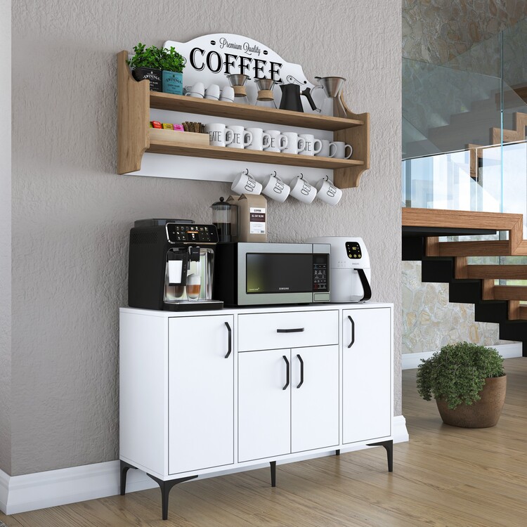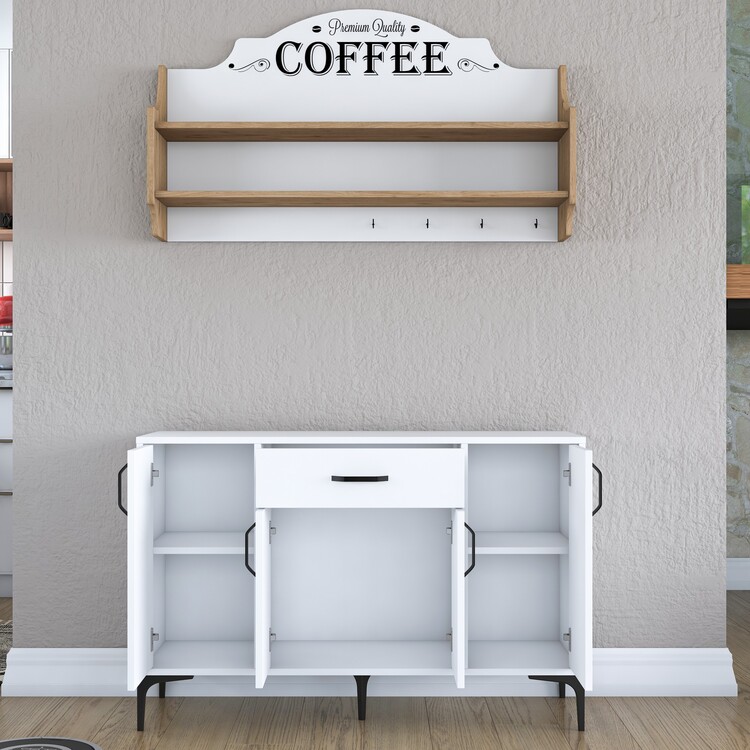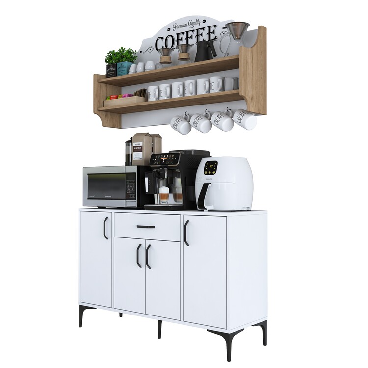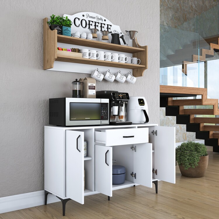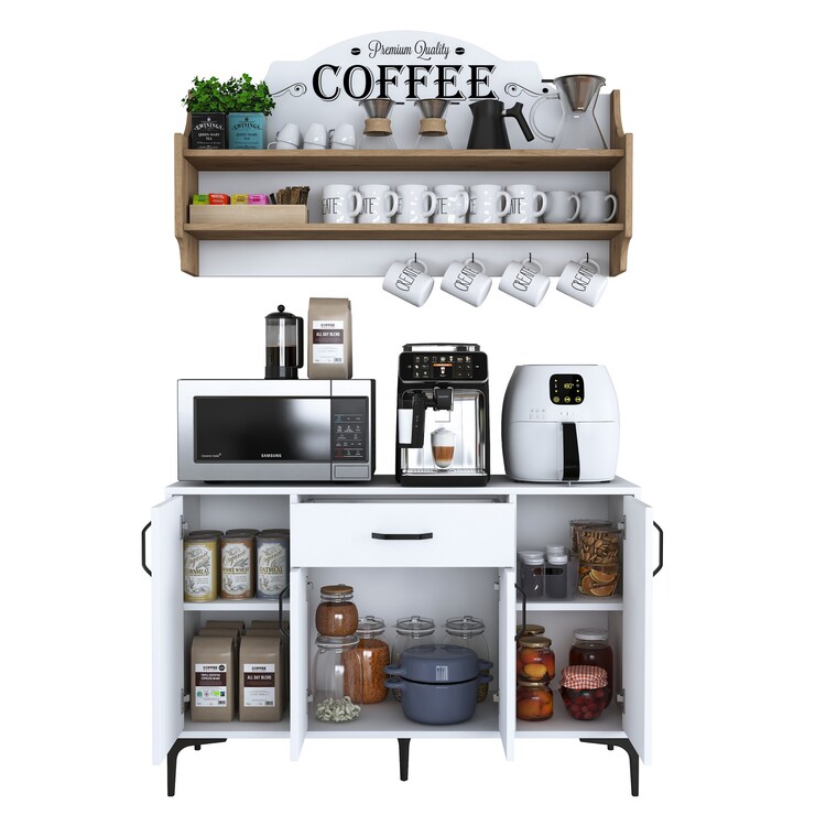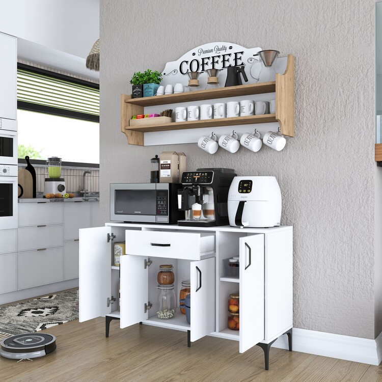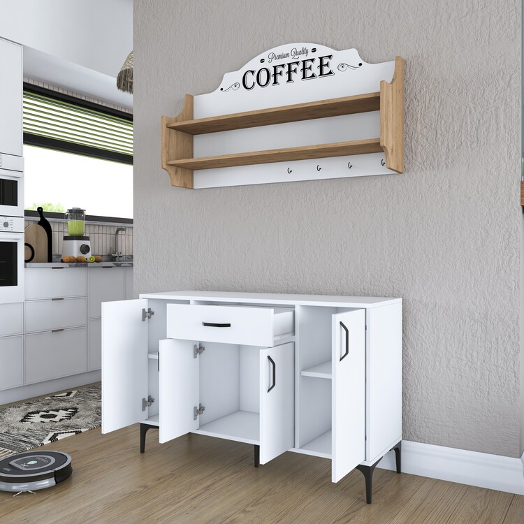Kuchyňská skříňka nabízí praktické uspořádání úložného prostoru. Obsahuje čtyři plná dvířka pro bezpečné uložení vašich kuchyňských potřeb, zásuvku na drobné předměty a odkládací polici s věšákem, která je ideální pro zavěšení utěrek nebo kuchyňských nástrojů.