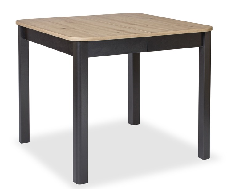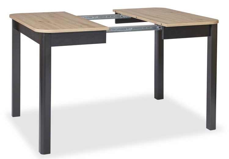 Rozkládací stůl s deskou artisan a černou podnoží. Výhodou stolu je, že noha stolu se při rozkládání stolu posouvá.