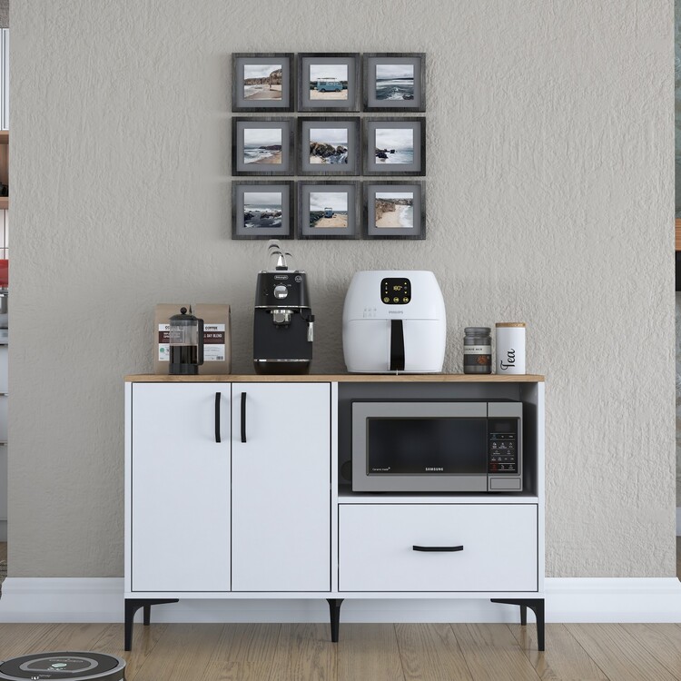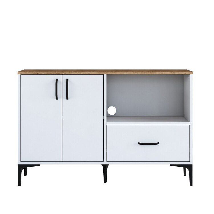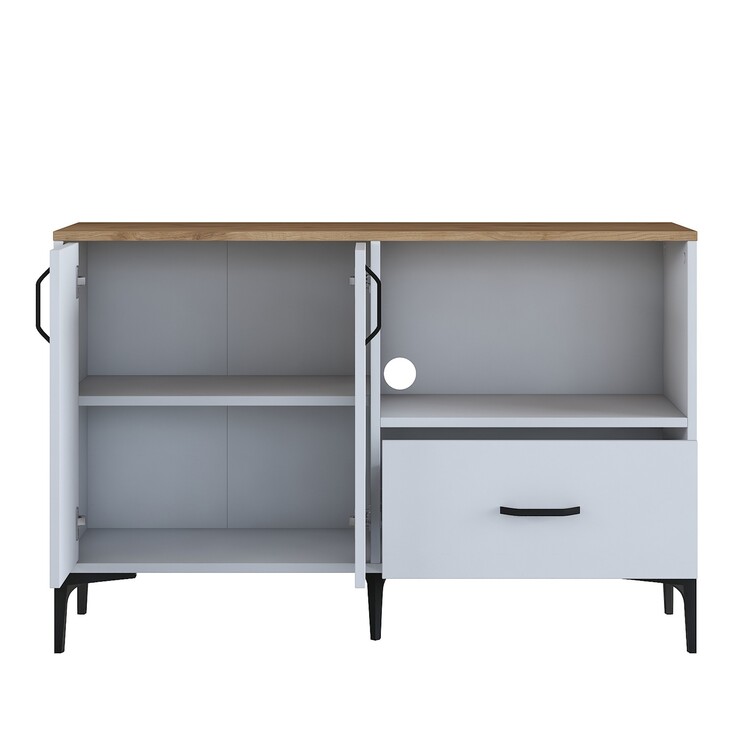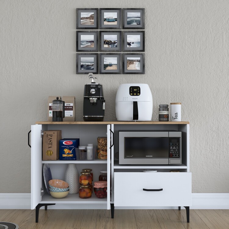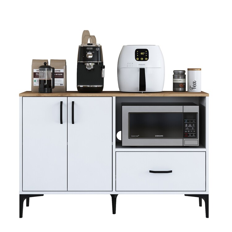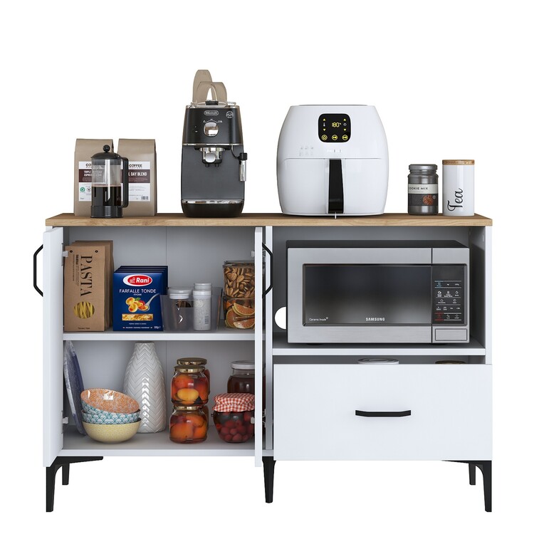 Skříňka je ideální pro umístění mikrovlnné trouby, a přitom nabízí další praktické úložné prostory. Je vybavena dvěma plnými dvířky, jednou zásuvkou a otevřeným regálkem pro snadný přístup k často používaným předmětům. Vysoce kvalitní materiály, jako melamin a VT laminát, zaručují dlouhou životnost a jednoduchou údržbu.
