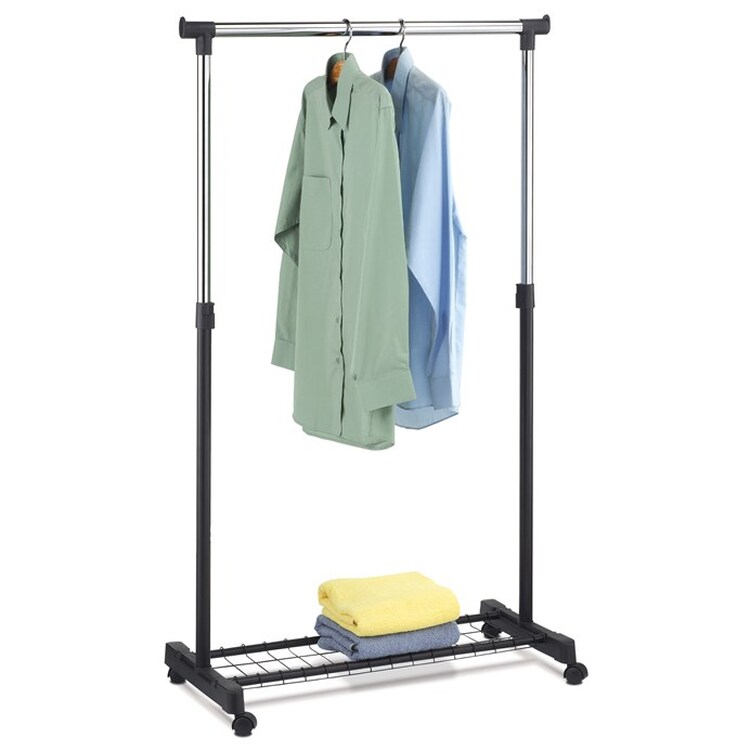 Jednoramenný stojan na šaty v černém provedení kombinuje pevný kov s odolným plastem a chromovanými prvky pro moderní vzhled. Výška stojanu je nastavitelná, což umožňuje přizpůsobení různým délkám oděvů a zajišťuje komfortní používání. Stabilní základna je vybavena kolečky pro snadnou manipulaci a praktickým odkladačem ve spodní části, který nabízí prostor pro uložení bot nebo dalších doplňků. Celková konstrukce je navržena pro dlouhou životnost a spolehlivost v každodenním provozu.