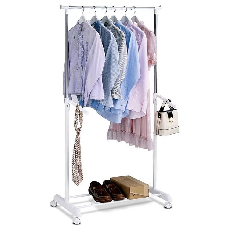Stojan na šaty s odkladačem a otočnými závěsy v bílé barvě kombinuje kovové a plastové materiály pro pevné a stabilní provedení. Výškově nastavitelná tyč umožňuje přizpůsobení podle potřeby, zatímco otočné závěsy na bocích poskytují praktické místo pro zavěšení doplňků jako jsou kabelky nebo kravaty. Spodní odkladač nabízí prostor pro uložení bot či krabic, což zvyšuje funkčnost a usnadňuje organizaci oblečení. Stojan je vybaven kolečky pro snadnou manipulaci a přesun v interiéru. Díky kombinaci chromovaných a bílých povrchů působí moderně a nenásilně zapadne do různých typů interiérů.