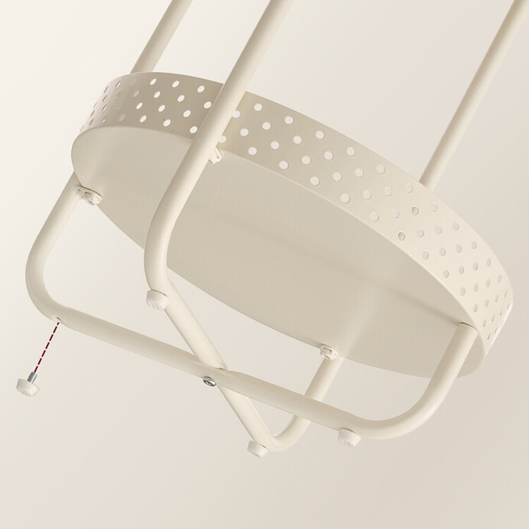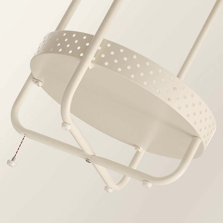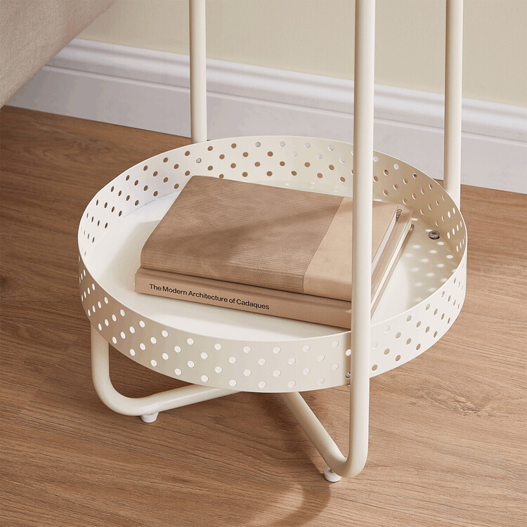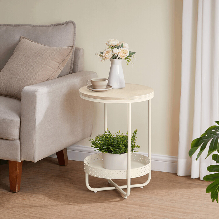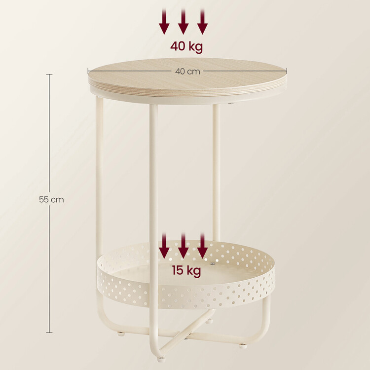 Odkládací stolek s rozměry 40×40×55 cm kombinuje desku z MDF s dekorem běleného dubu a matnou povrchovou úpravou s pevnou kovovou konstrukcí v béžovém odstínu. Kulatá deska nabízí stabilní plochu pro odložení drobných předmětů, zatímco spodní odkládací prostor s perforovaným kovovým okrajem poskytuje praktické místo pro další uskladnění. Kovové nohy jsou vybaveny rektifikačními patkami, které umožňují vyrovnání stolku na nerovném povrchu a zajišťují stabilitu. Celkový design je jednoduchý a funkční, vhodný do moderních i klasických interiérů.