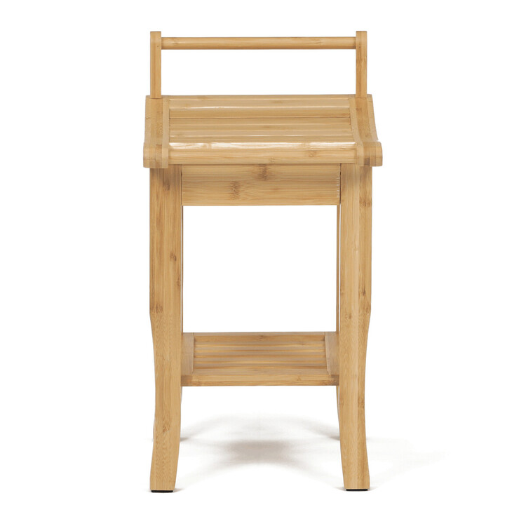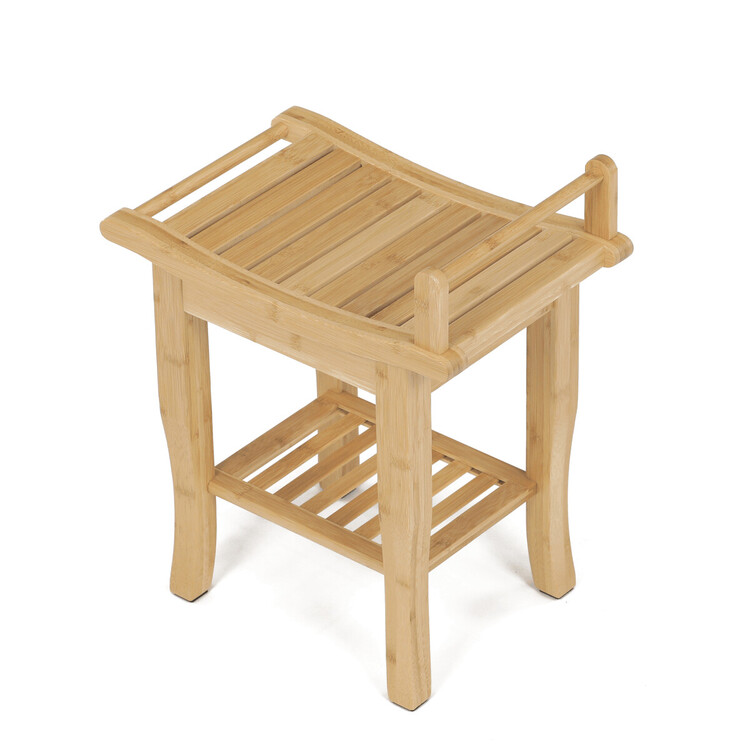 Stolička z masivního bambusu v přírodním odstínu nabízí pevné a stabilní provedení vhodné pro různé interiéry. Sedák je tvořený vodorovnými lamelami s mírným prohnutím pro pohodlnější sezení, doplněný o praktickou polici pod sedákem pro uložení obuvi či dalších drobností. Bambusový materiál je navržen pro dlouhou životnost a snadnou údržbu, přičemž jeho přírodní textura přináší do prostoru příjemný vizuální efekt. Nožky jsou opatřeny ochrannými kluzáky, které zabraňují poškození podlahy. Rozměry a nosnost odpovídají běžným požadavkům na domácí použití.