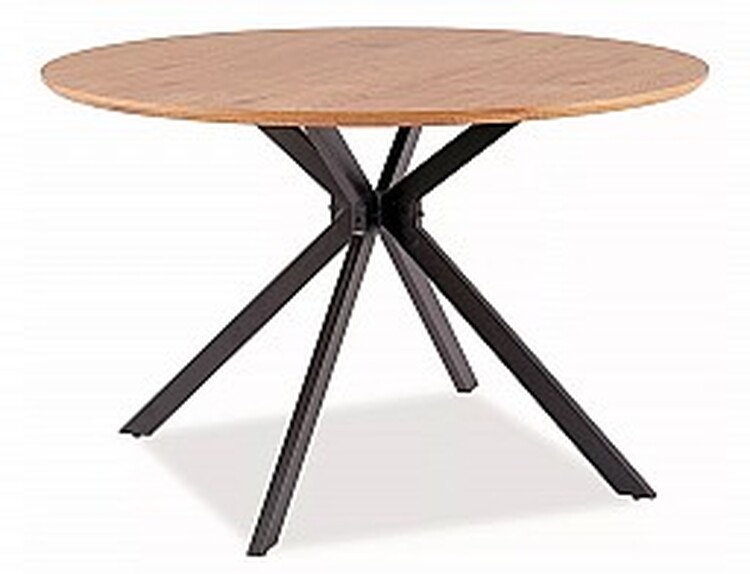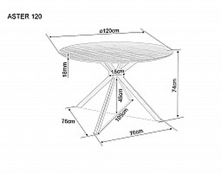 Jídelní stůl ASTER má průměr 120 cm a je ideální pro menšíjídelny či kuchyně. Deska stolu je vyrobena z MDF a dýhy, což zajišťujepevnost a snadnou údržbu. Rám stolu je kovový v matné černé barvě, cožstolu dodává moderní vzhled a stabilitu.