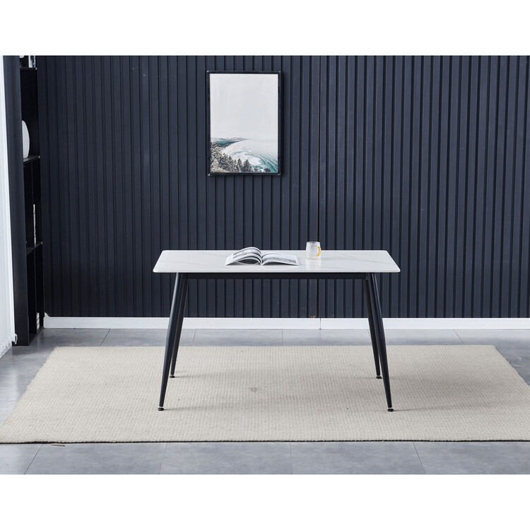 Jídelní stůl HT-403M WT kombinuje moderní design s praktickými vlastnostmi vhodnými pro každodenní použití. Deska stolu je vyrobena ze slinuté keramiky v matném provedení s jemnou imitací mramoru, která nabízí odolnost proti poškrábání a snadnou údržbu. Zaoblené rohy desky přispívají k bezpečnosti a zároveň dodávají stolku elegantní vzhled. Stabilní kovové nohy v černé barvě zajišťují pevnou oporu a dlouhou životnost nábytku.