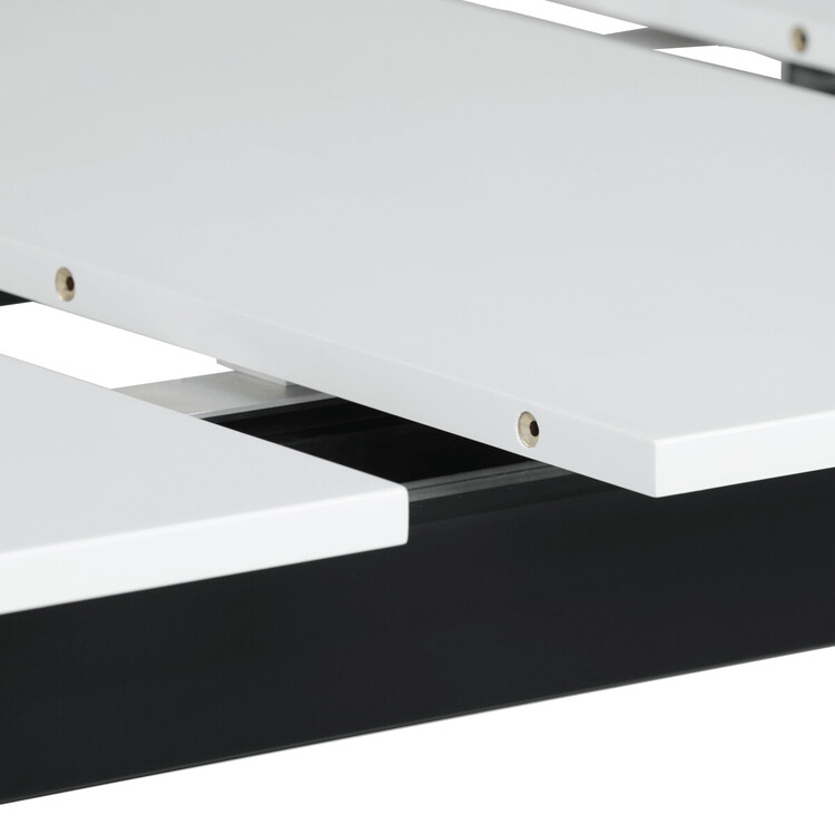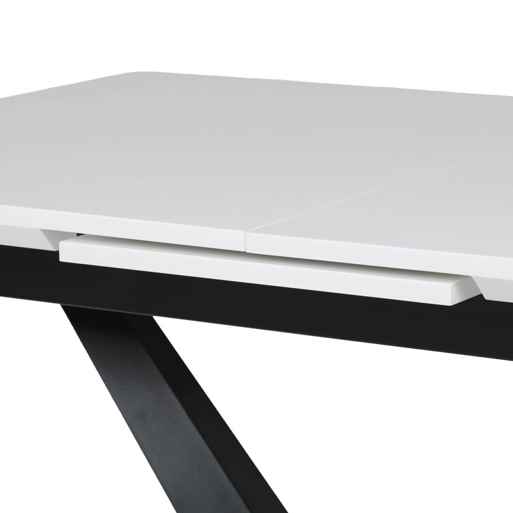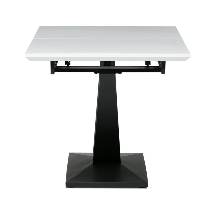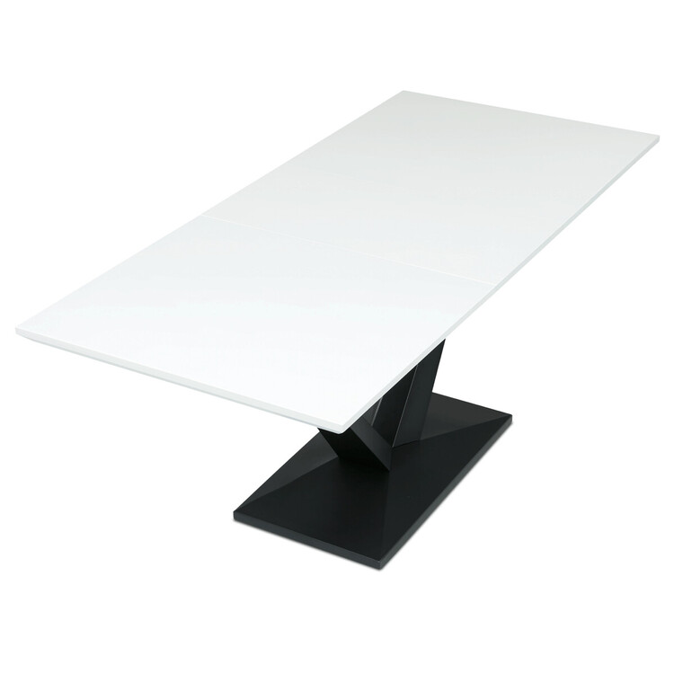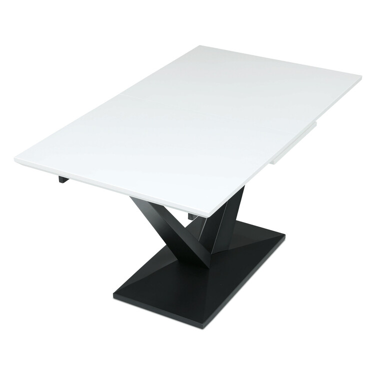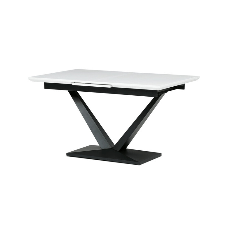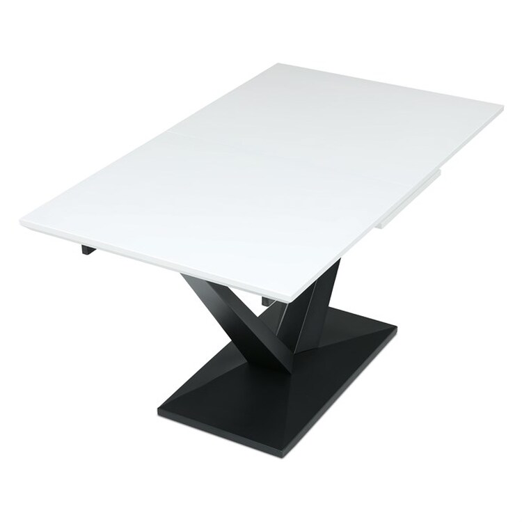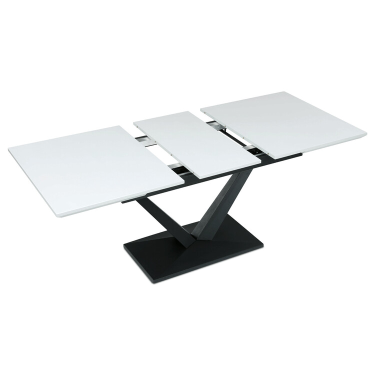 Rozkládací jídelní stůl značky Autronic vyniká svou robustní centrální nohou ve tvaru V. Bílá matná deska z MDF materiálu nabízí odolný a snadno udržovatelný povrch, ideální pro každodenní stolování. Díky rozkládacímu mechanismu snadno přizpůsobíte velikost stolu aktuálním potřebám, což je skvělé pro rodinná setkání nebo hosty.Tento stůl bude stylovým a funkčním doplňkem každé jídelny, který zaujme na první pohled.