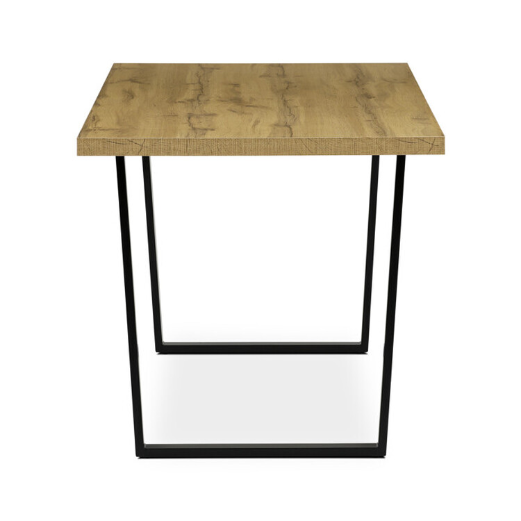 Jídelní stůl o rozměrech 160×80×76 cm kombinuje desku z hnědého lamina s dekorem dubu a stabilní kovovou podnož v černém matném provedení. Deska je opatřena ABS hranou, která chrání okraje před poškozením a usnadňuje údržbu, zatímco matný povrch zajišťuje příjemný vzhled bez lesku. Pevná kovová podnož poskytuje vysokou stabilitu a nosnost, což umožňuje pohodlné využití v jídelních prostorách. Materiál desky je navržen pro snadnou údržbu a odolnost vůči běžnému opotřebení, což přispívá k dlouhé životnosti stolu. Tento model je ideální volbou pro moderní interiéry, kde se klade důraz na funkčnost a jednoduchý design.