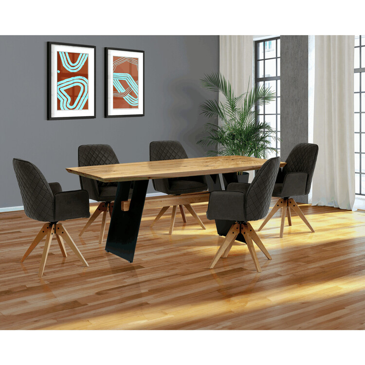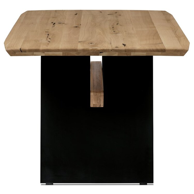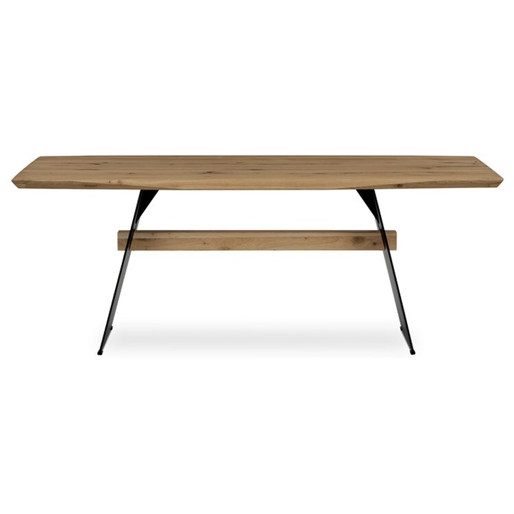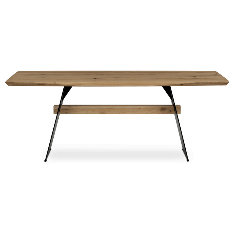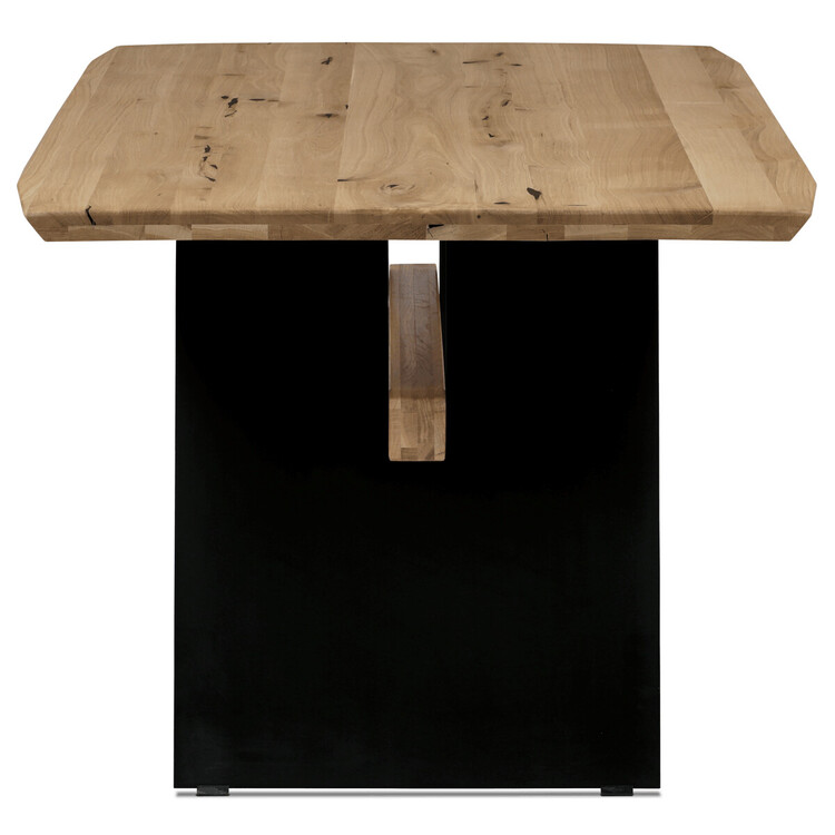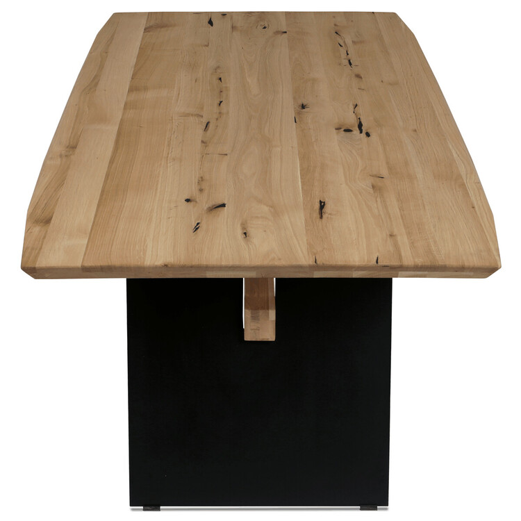 Jídelní stůl o rozměrech 200×100×75 cm kombinuje masivní dubovou desku s olejovanou povrchovou úpravou a stabilní kovovou podnoží v černé barvě. Masivní dubová deska v přírodním odstínu nabízí výraznou strukturu dřeva s viditelnými letokruhy a suky, které podtrhují autentický charakter materiálu. Olejovaný povrch zajišťuje ochranu dřeva a zároveň umožňuje zachovat jeho přirozený vzhled a příjemnou strukturu na dotek. Kovová podnož je navržena tak, aby poskytovala pevnou a stabilní oporu, přičemž její černé matné provedení kontrastuje s teplým tónem dřeva a dodává celku moderní industriální nádech. Stůl je určen pro každodenní použití v jídelnách či kuchyních, kde oceníte jeho robustnost i estetickou hodnotu.
