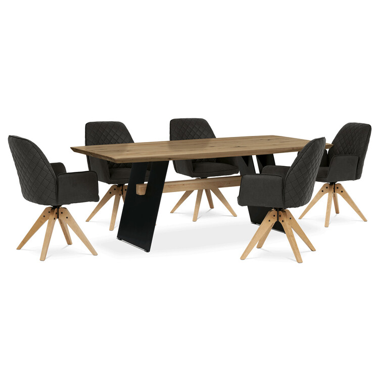 Jídelní stůl o rozměrech 200×100×75 cm kombinuje masivní dubovou desku s olejovanou povrchovou úpravou a stabilní kovovou podnoží v černé barvě. Masivní dubová deska v přírodním odstínu nabízí výraznou strukturu dřeva s viditelnými letokruhy a suky, které podtrhují autentický charakter... více informací o zboží
