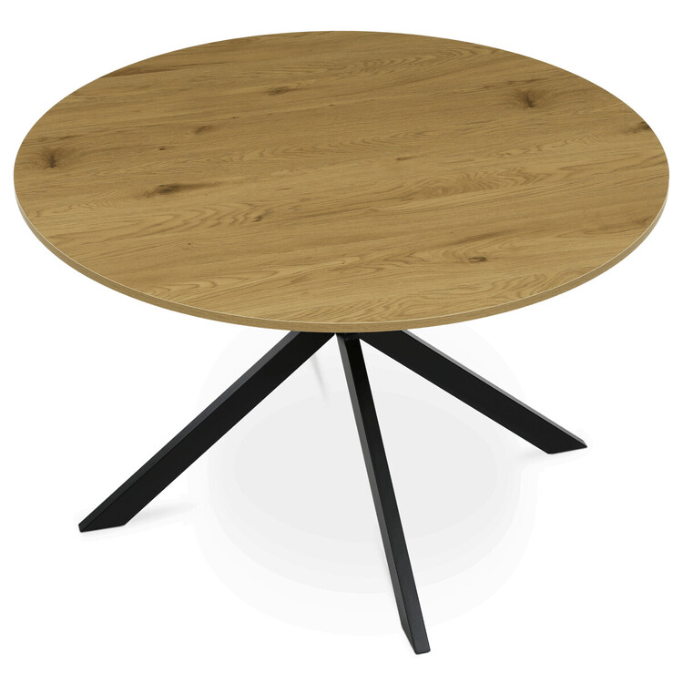 Jídelní kulatý stůl HT-F4120 OAK značky Autronic vyniká kombinací přírodního dekoru divokého dubu a robustní konstrukce s černými kovovými nohami. Deska stolu je vyrobena z MDF materiálu s tloušťkou optimalizovanou pro odolnost a stabilitu, opatřená ABS hranou, která chrání okraje před poškozením a zajišťuje dlouhou životnost. Kovová podnož je tvořena čtyřmi širokými nohami uspořádanými do kříže, což zajišťuje vysokou pevnost a stabilitu celé konstrukce, přičemž povrch nohou je upraven práškovým lakem pro zvýšení odolnosti proti korozi a mechanickému opotřebení. Praktickou vlastností jsou rektifikační nohy umožňující vyrovnání stolu na nerovném povrchu, což zvyšuje komfort používání a zabraňuje kývání. Kulatý tvar desky podporuje rovnoměrné rozložení prostoru pro sezení a usnadňuje komunikaci mezi uživateli, což ocení zejména v jídelních prostorách. Stůl je vhodný pro domácnosti i komerční provozy, kde je kladen důraz na kombinaci estetického vzhledu a funkčnosti. Rozměry 120 cm v průměru a výška 75 cm poskytují dostatek prostoru pro pohodlné stolování, přičemž nosnost konstrukce odpovídá běžným požadavkům na jídelní nábytek.