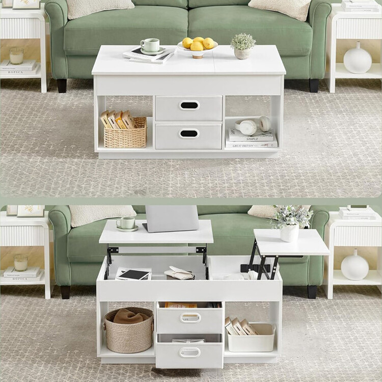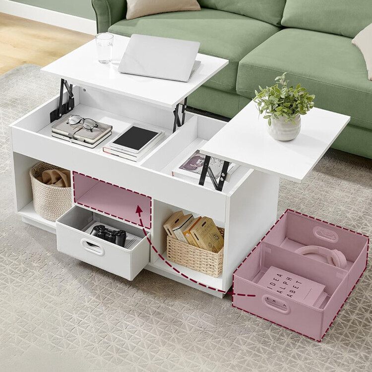 Konferenční stůl AKF-E1021 WT nabízí praktické řešení pro moderní obývací prostory díky své rozkládací funkci a úložnému prostoru. Deska stolu je vyrobena z MDF s matnou bílou povrchovou úpravou v dekoru dřeva, která zajišťuje odolnost proti poškrábání a snadnou údržbu. Stůl disponuje dvěma výklopnými deskami, pod kterými se nachází prostorné úložné přihrádky vhodné pro uložení drobných předmětů či časopisů. Konstrukce je stabilní a pevná, umožňuje nastavení výšky v rozmezí 48,5 až 62 cm, což přispívá k ergonomickému využití. Rozměry 100×50 cm poskytují dostatek pracovní nebo odkládací plochy, zatímco kompaktní design usnadňuje začlenění do různých interiérů.