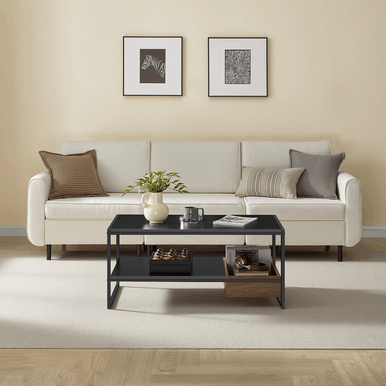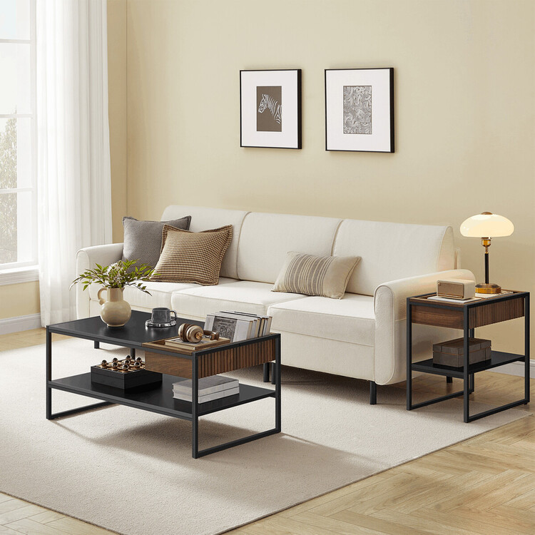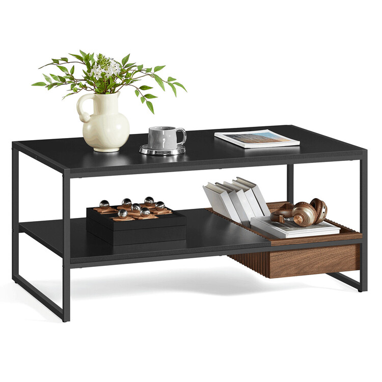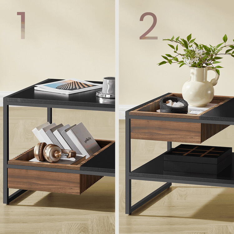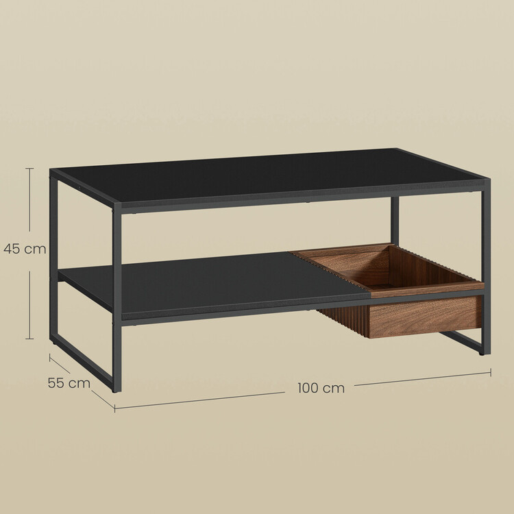 Konferenční stolek o rozměrech 100×55×45 cm kombinuje pevnou kovovou konstrukci s deskou z MDF v matném černém provedení s dekorem přírodního ořechu. Stolek nabízí praktický úložný prostor v podobě otevřené police a zásuvky s výraznou dřevěnou strukturou, která doplňuje moderní design.... více informací o zboží