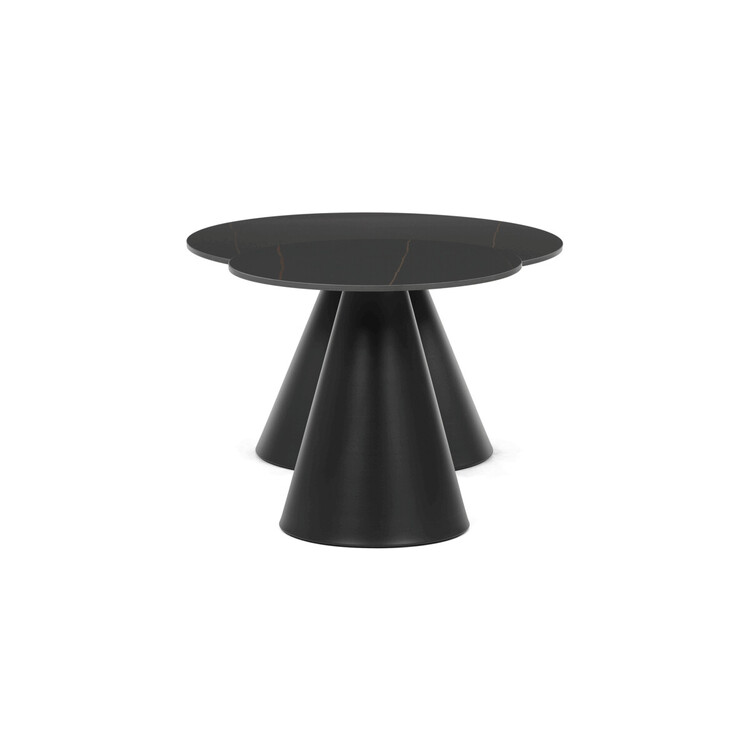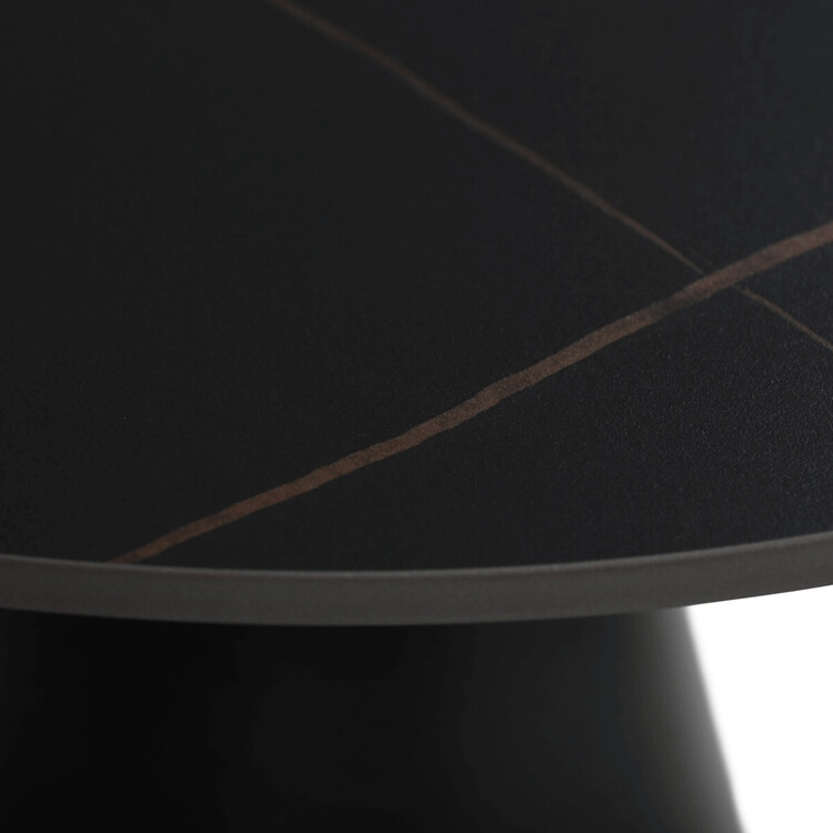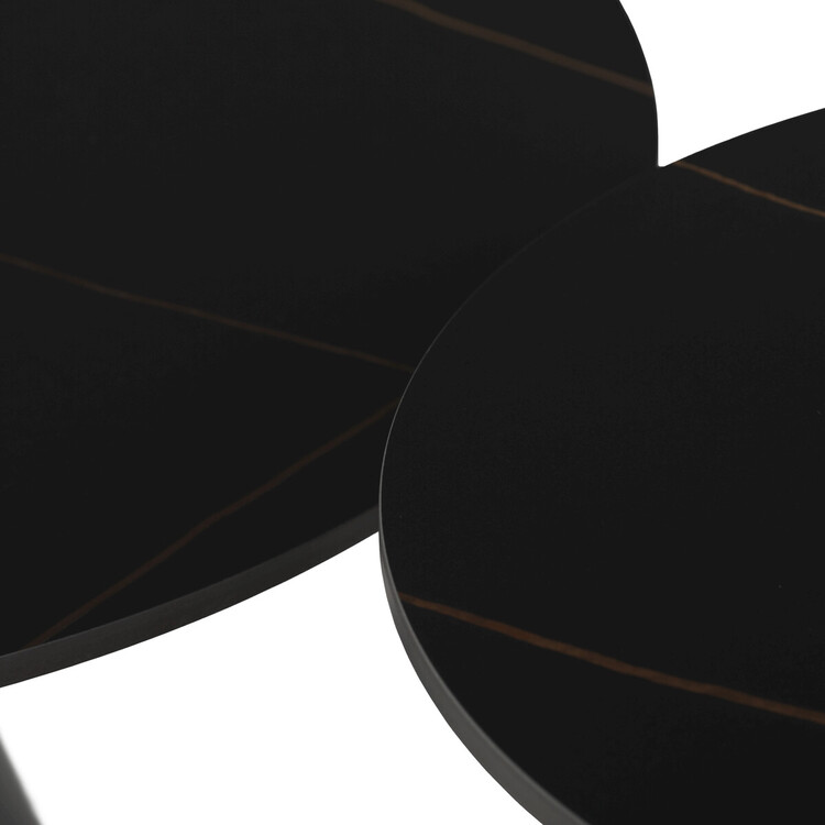 Sada dvou konferenčních stolů v moderním designu kombinuje černou keramickou desku s mramorovým dekorem a stabilní kovovou podnoží v matném provedení. Větší stůl má průměr 70 cm a výšku 40,5 cm, menší pak průměr 50 cm a výšku 47 cm, což umožňuje variabilní uspořádání v prostoru. Keramická deska je odolná vůči poškrábání a snadno se udržuje, což zajišťuje dlouhodobou estetiku i funkčnost. Kovová podnož přispívá k pevnosti a stabilitě stolů, které jsou vhodné do moderně zařízených obývacích pokojů či kanceláří. Matný povrch podtrhuje elegantní vzhled a decentní mramorový vzor dodává stolům nadčasový charakter.