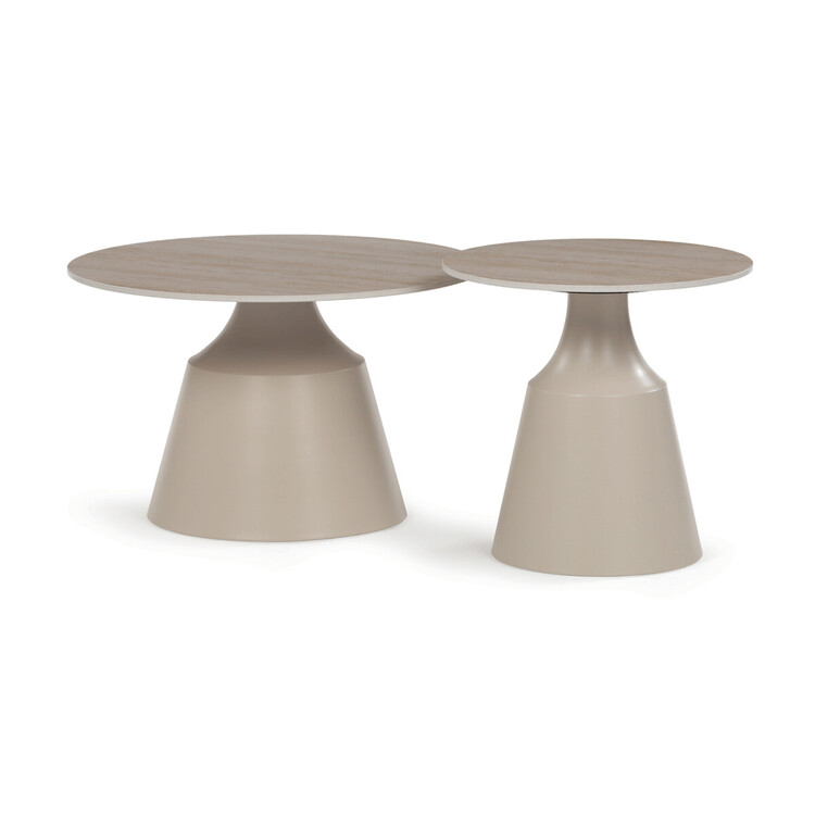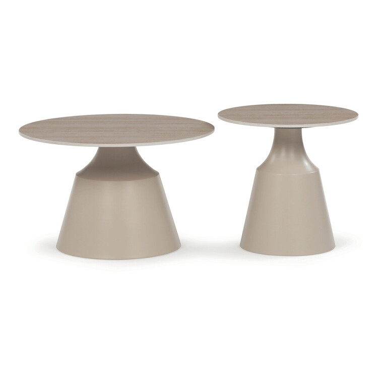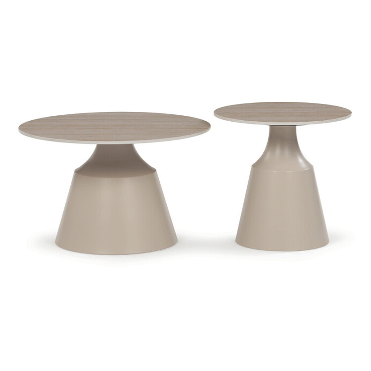 Sada dvou konferenčních stolů v béžovém odstínu kombinuje keramické desky s matnou povrchovou úpravou a stabilní kovové podnože, které zajišťují pevnost a dlouhou životnost. Větší stůl má průměr 70 cm a výšku 43,5 cm, menší pak průměr 50 cm a výšku 48,5 cm, což umožňuje variabilní uspořádání v... více informací o zboží