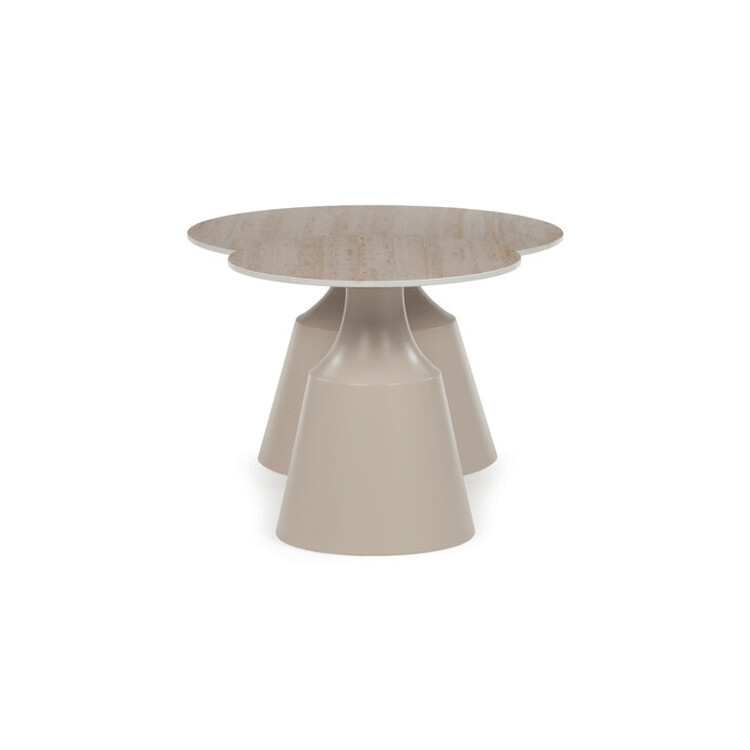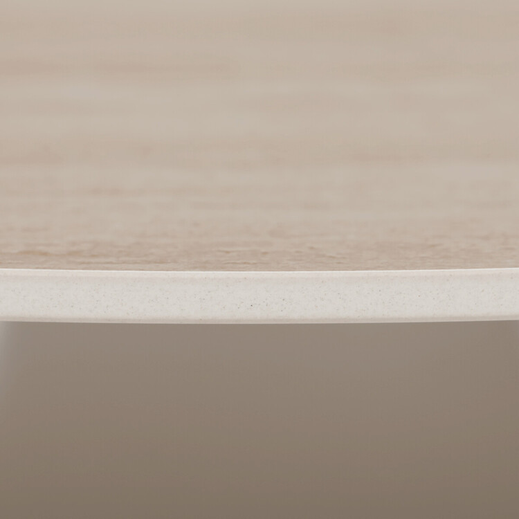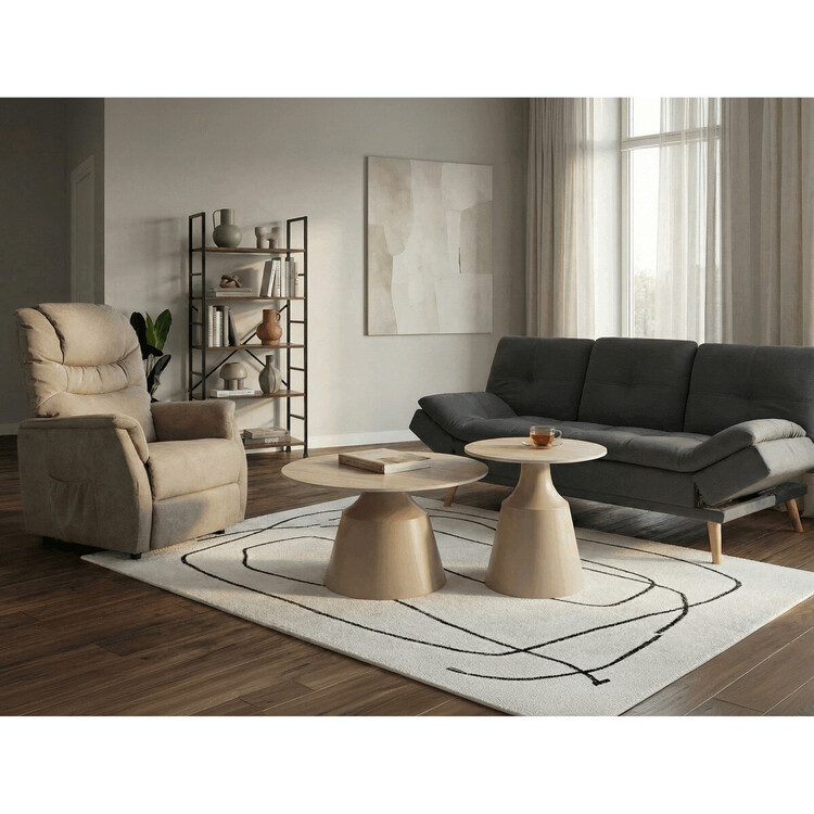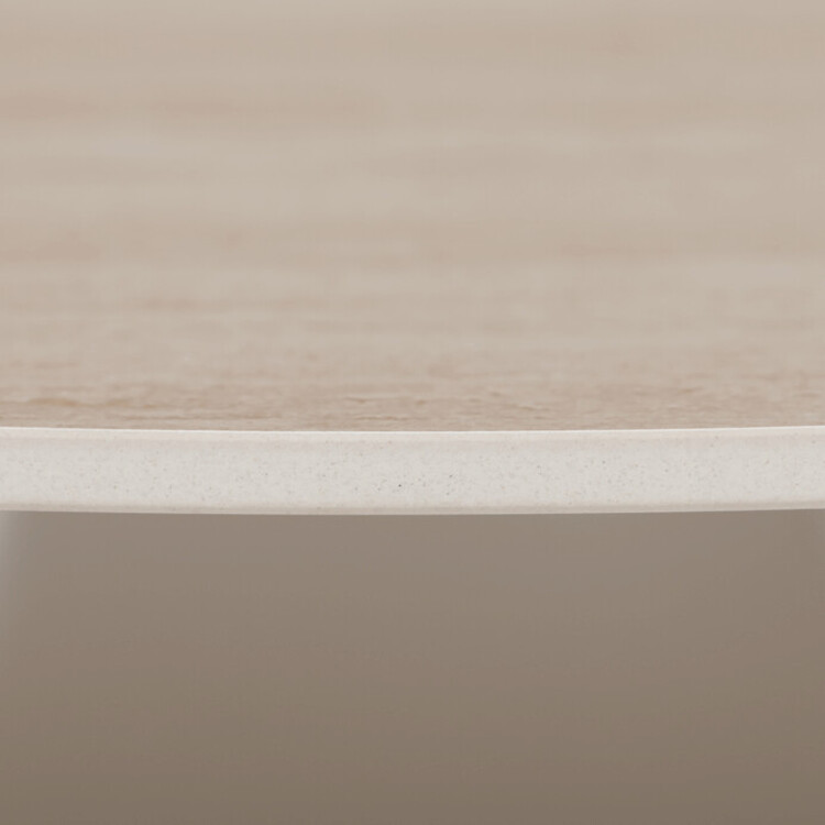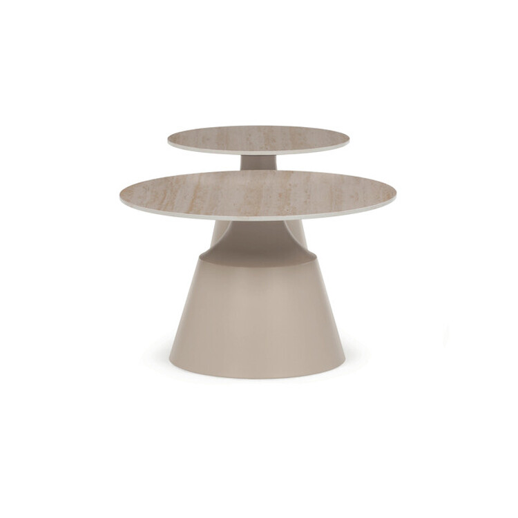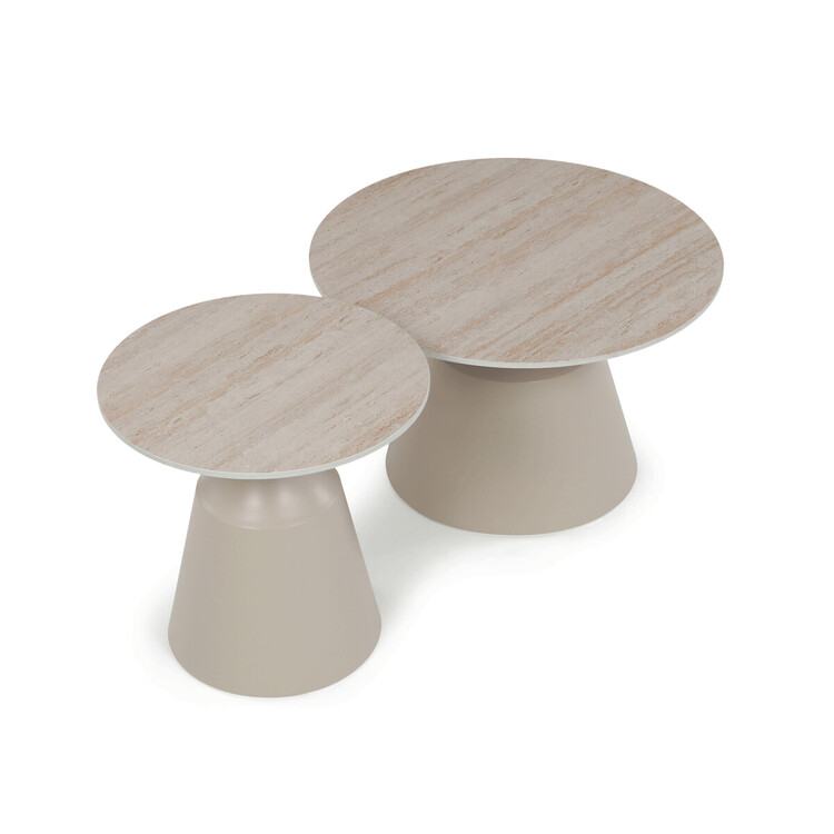 Sada dvou konferenčních stolů v béžovém odstínu kombinuje keramické desky s matnou povrchovou úpravou a stabilní kovové podnože, které zajišťují pevnost a dlouhou životnost. Větší stůl má průměr 70 cm a výšku 43,5 cm, menší pak průměr 50 cm a výšku 48,5 cm, což umožňuje variabilní uspořádání v prostoru. Keramická deska je odolná vůči poškrábání a snadno se udržuje, což přispívá k praktickému využití v moderních interiérech. Kovová podnož je navržena pro stabilitu a bezpečné umístění na různých typech podlah. Design stolů s jemným travertinovým vzorem dodává prostoru přírodní a zároveň současný vzhled.