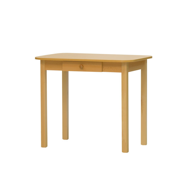 Stůl v kompaktních rozměrech 90×65cm se zaoblenými rohy s praktickou zásuvkou 25,5×31×,5cm. Deska lamino 18mm, nohy masiv 5×5cm. Vhodný do malého prostoru.