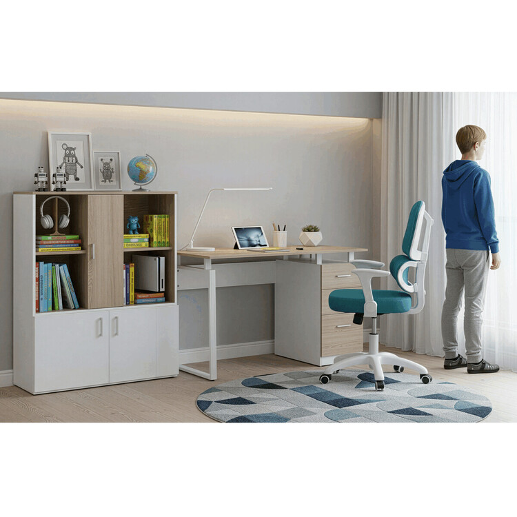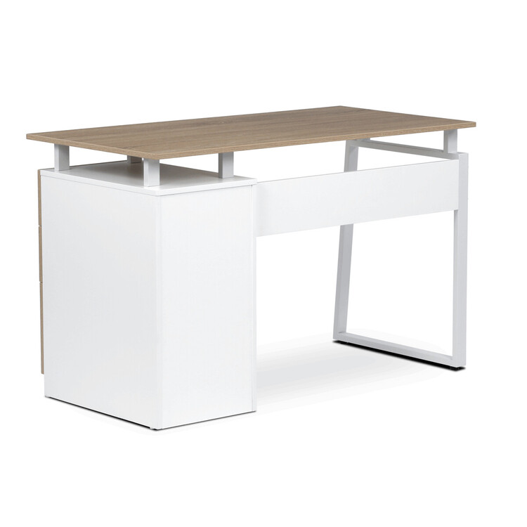 Pracovní stůl se šuplíky v dekoru dub sonoma kombinuje praktický úložný prostor s moderním designem vhodným do kanceláří i domácích pracovních koutů. Deska stolu je vyrobena z melaminu s matnou povrchovou úpravou, která zajišťuje odolnost proti poškrábání a snadnou údržbu. Pevné kovové nohy v bílé barvě poskytují stabilní oporu a dodávají celku industriální nádech. Tři prostorné zásuvky s kovovými úchytkami umožňují efektivní organizaci pracovních potřeb. Rozměry 120×60×75 cm nabízejí dostatek prostoru pro práci i uložení dokumentů.