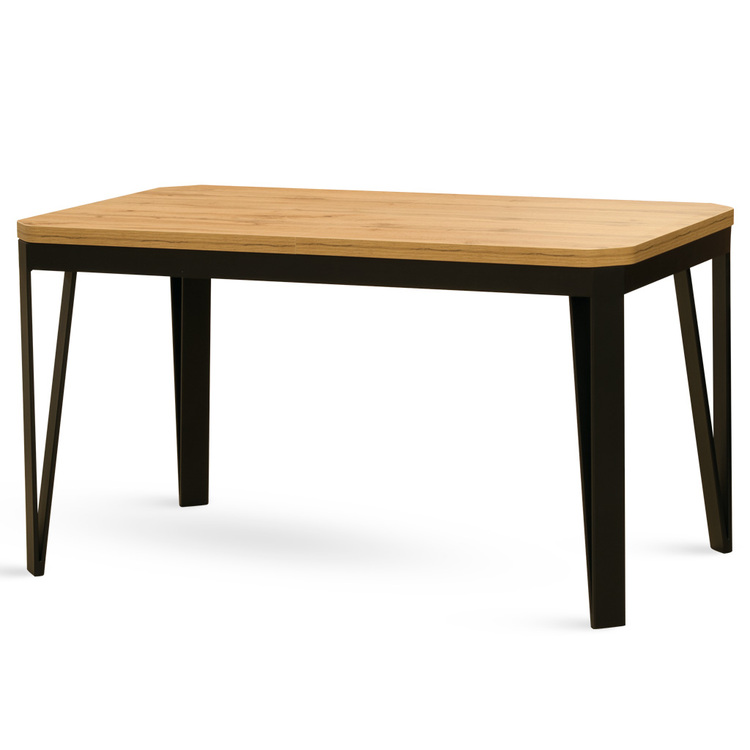 Rozkládací jídelní stůl. Kombinace pevné kovové podnože a lamino desky.