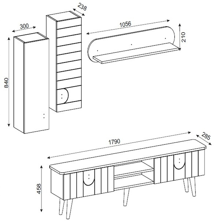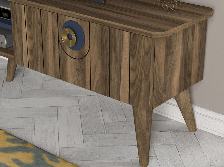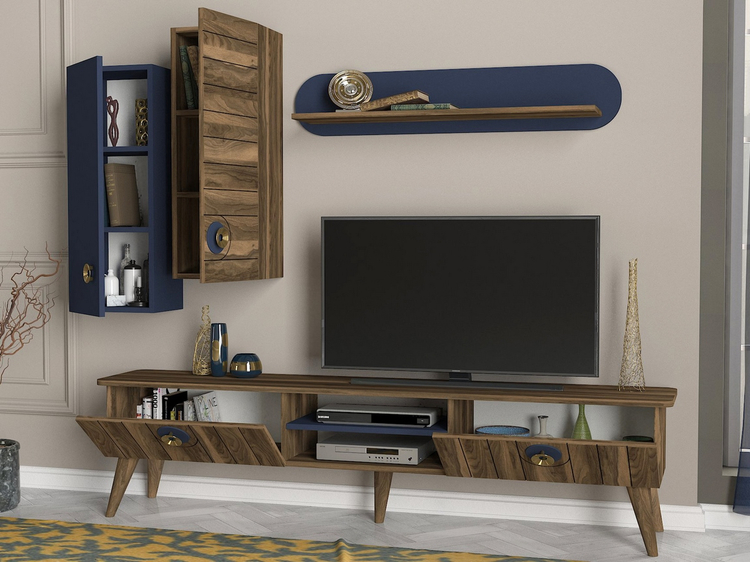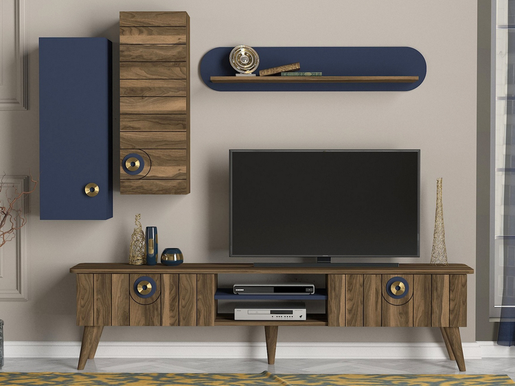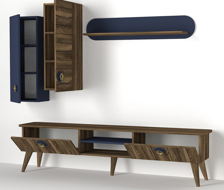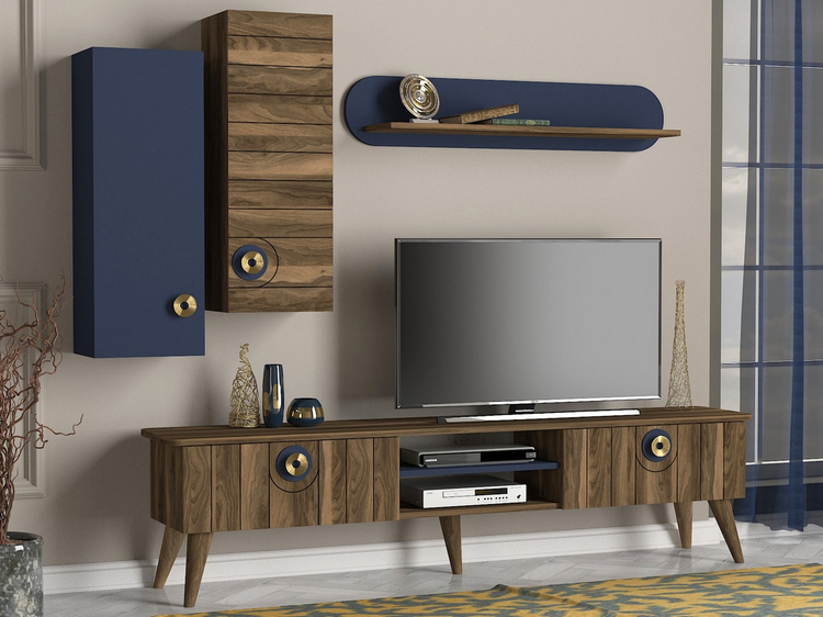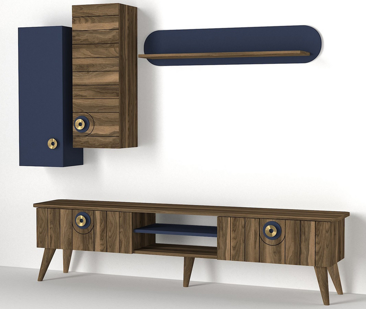 Televizní sestava je vyrobena z kvalitního lamina o tl.18 mm hraněné PVC páskou, odolného proti poškrábání v kombinaci barev vlašský ořech/modrá loft. Sestava se skládá z těchto položek(Š x V x H cm) – televizní stolek (179 × 45,8 × 29 cm),závěsná skříňka 2 ks (30 × 84 × 23,8 cm) a závěsná police (105 × 21 × 16 cm). Dodáváme v demontovaném stavu.CASA 28044