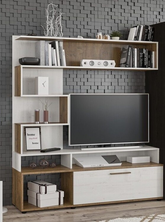 Televizní stěna do obývacího pokoje v moderním provedení je vyrobena z kvalitní LTD desky v barevné kombinaci dub april/anderson. Volný prostor pro televizi činí 100,3 × 82,4 cm. Dodáváme v demontovaném stavu.