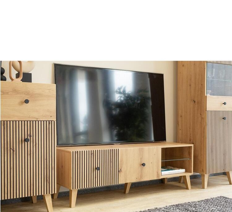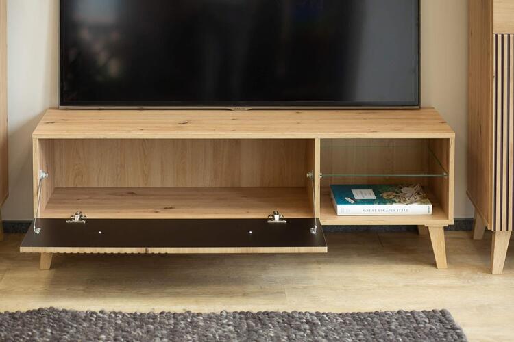 Televizní stolek s výklopnými dvířky je vyroben z kvalitní LTD v barevném provedení dub artisan/černá. Netradiční frézování předních dvířek v kombinaci s minimalistickými úchyty a vysokými nožkami, dodává této kolekci moderní vzhled. Nabídka komponentů této sektorové řady umožňuje sestavit si... více informací o zboží
