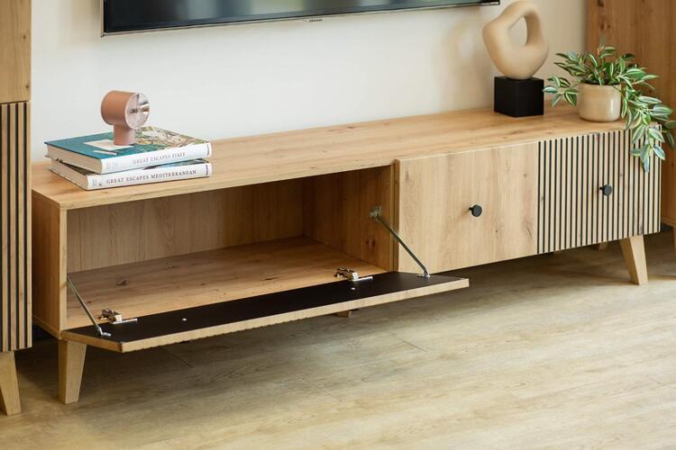 Televizní stolek se dvěma výklopnými dvířky je vyroben z kvalitní LTD v barevném provedení dub artisan/černá. Netradiční frézování předních dvířek v kombinaci s minimalistickými úchyty a vysokými nožkami, dodává této kolekci moderní vzhled. Nabídka komponentů této sektorové řady umožňuje sestavit si nábytek dle vlastních představ. Dodáváme v demontovaném stavu.CASA 85025
