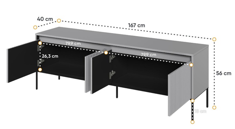 přední strana MDF 18 mm s půlkruhovým frézováním, vše hraněno ABS