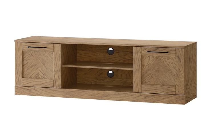 Televizní stolek se dvěma dvířky v nadčasovém provedení. Korpus je vyroben z přírodní dýhy v barvě dub rustikální, dvířka jsou vyrobeny z masivu v kombinaci s přírodní dýhou v zajímavém dekoru rybí kost v provedení dub rustikální olejovaný. Úchyty jsou kovové v barvě černá mat. Dvířka disponují systémem tichého dovírání. Dodáváme již ve smontovaném stavu.CASA 75098