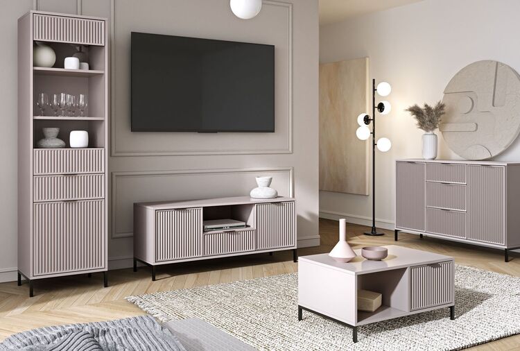 Nábytek je zdoben vzorem na čelních stranách v podobě frézovaných drážek. Všechny kusy nábytku z této kolekce stojí na černých kovových nožkách. Jednoduché a funkční tvary se hodí do obývacího pokoje, ložnice i jídelny.