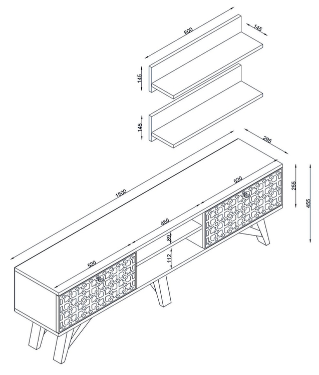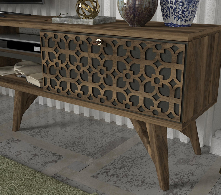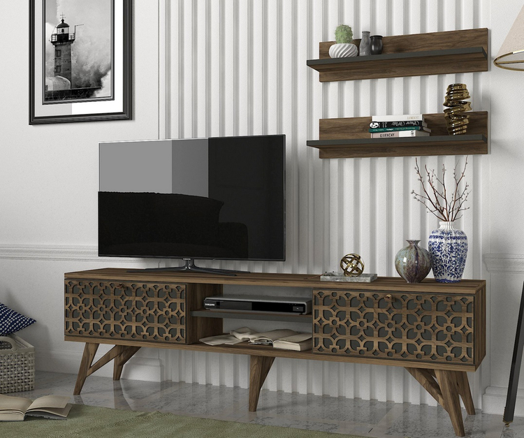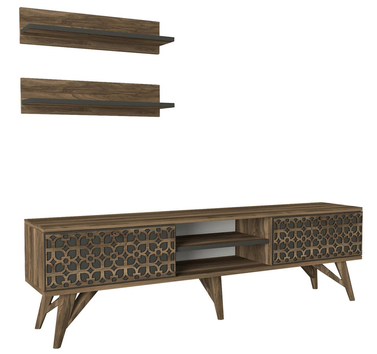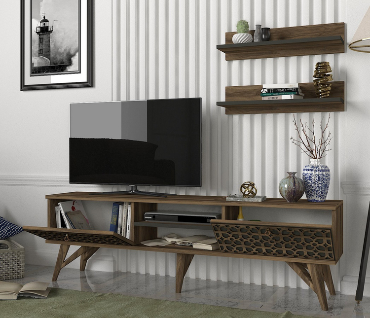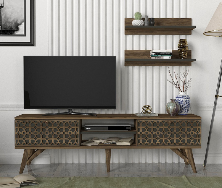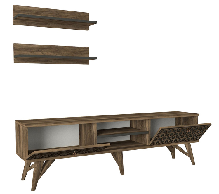 Televizní stolek s dvěma ozdobnými výklopnými dvířky je vyroben z kvalitního lamina o tl.18 mm hraněné PVC páskou, odolného proti poškrábání v barvě vlašský ořech. Součástí balení jsou také dvě závěsné police o rozměrech (Š x V x H cm) 50 × 15 × 15 cm. Dodáváme v demontovaném stavu.CASA 28029