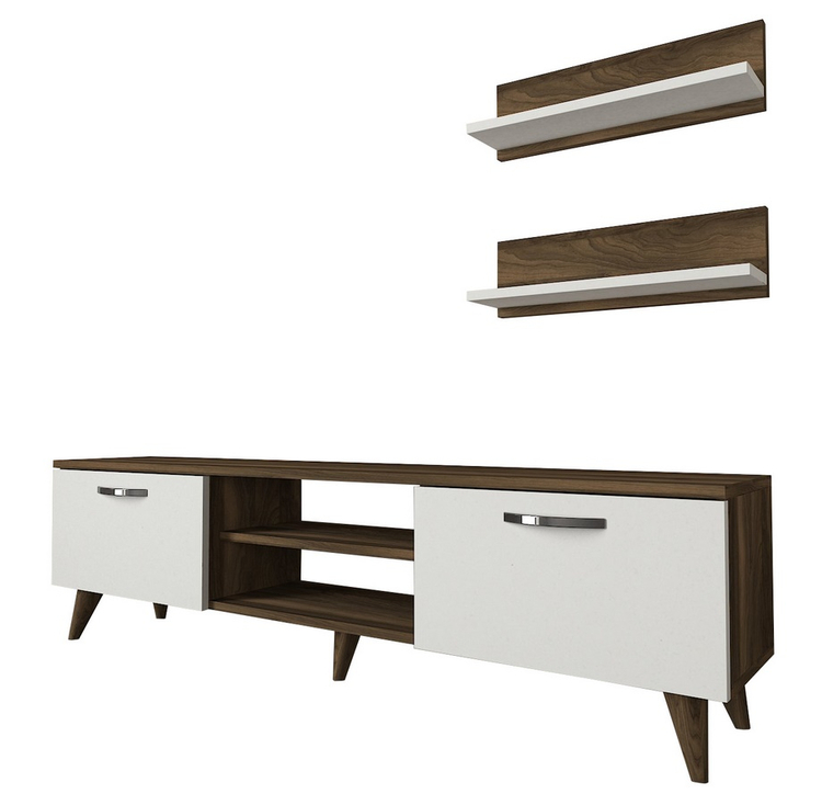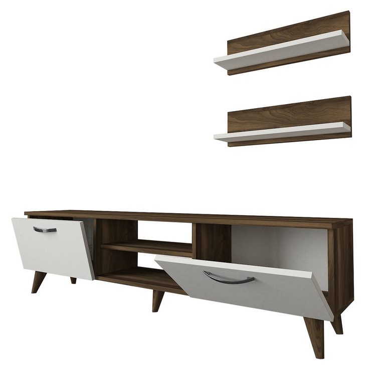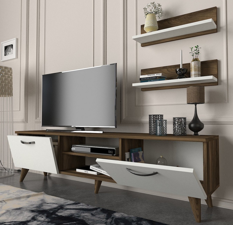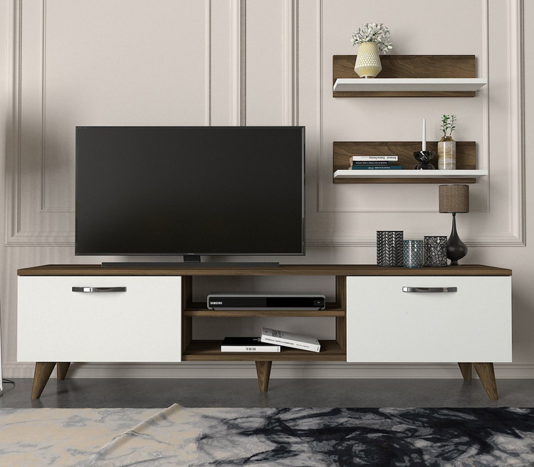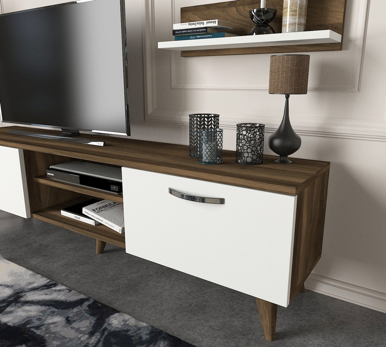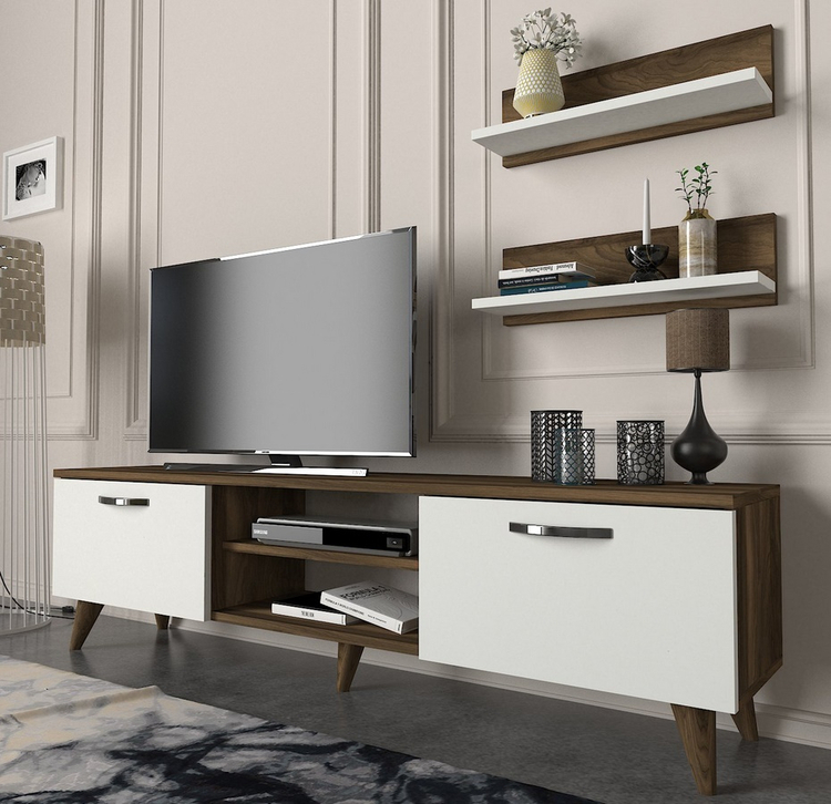Televizní stolek s dvěma výklopnými dvířky je vyroben z kvalitního lamina o tl.18 mm hraněné PVC páskou, odolného proti poškrábání v kombinaci barev vlašský ořech/bílá. Součástí balení jsou také dvě závěsné police o rozměrech (Š x V x H cm) 50 × 15 × 12,5 cm. Dodáváme v demontovaném stavu.CASA 28012