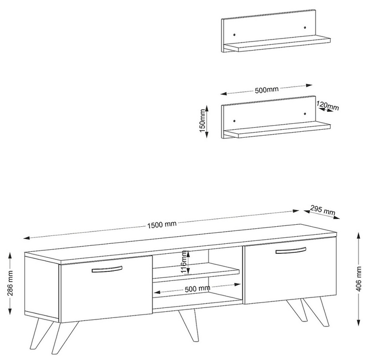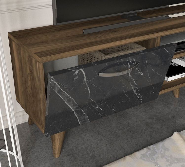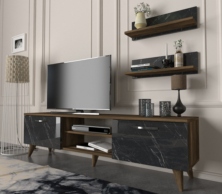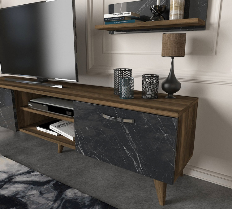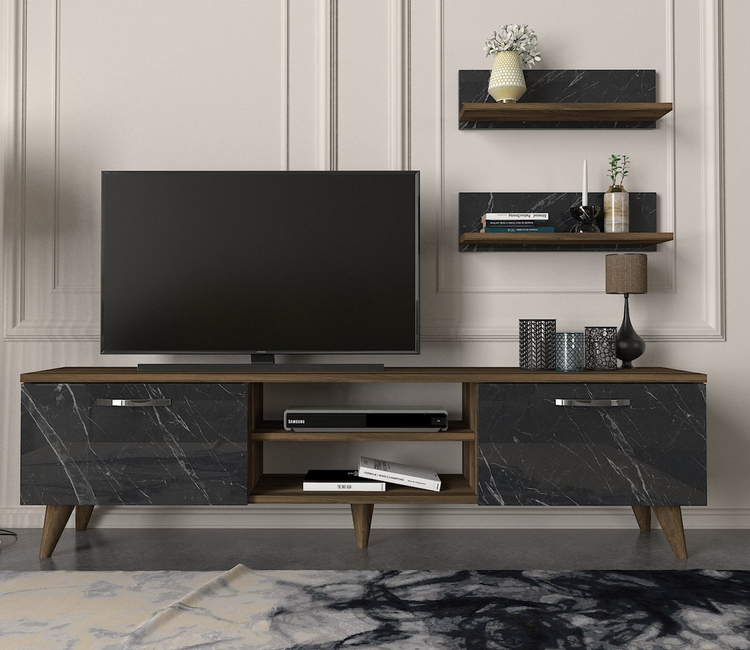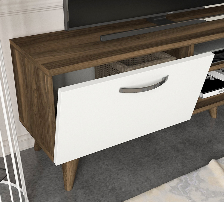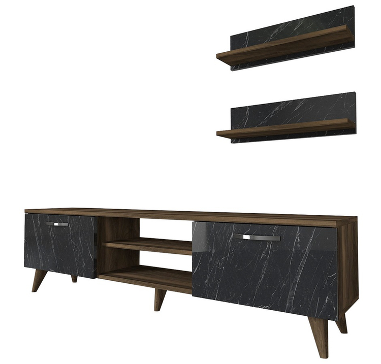 Televizní stolek s dvěma výklopnými dvířky je vyroben z kvalitního lamina o tl.18 mm hraněné PVC páskou, odolného proti poškrábání v kombinaci barev vlašský ořech/bílá. Součástí balení jsou také dvě závěsné police o rozměrech (Š x V x H cm) 50 × 15 × 12,5 cm. Dodáváme v demontovaném stavu.CASA 28012