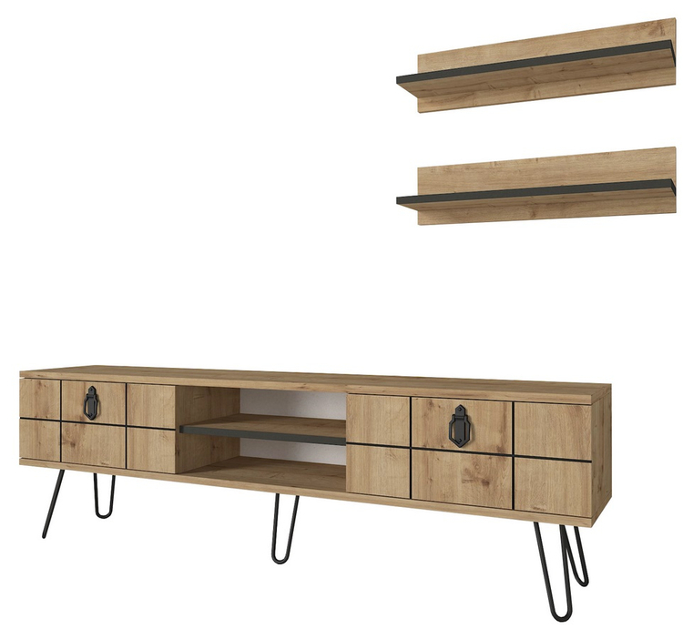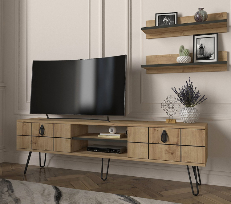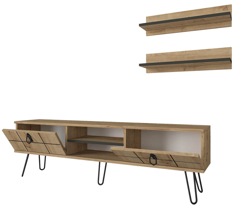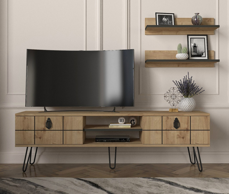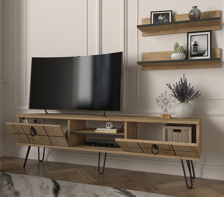 Televizní stolek s výklopnými dvířky je vyroben z kvalitního lamina o tl.18 mm hraněné PVC páskou, odolného proti poškrábání v barvě sapphire. Součástí balení jsou také dvě závěsné police o rozměrech (Š x V x H cm) 60 × 14,5 × 14,5 cm. Dodáváme v demontovaném stavu.více informací o zboží