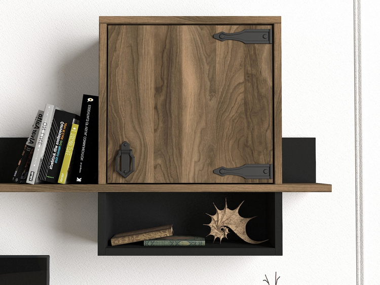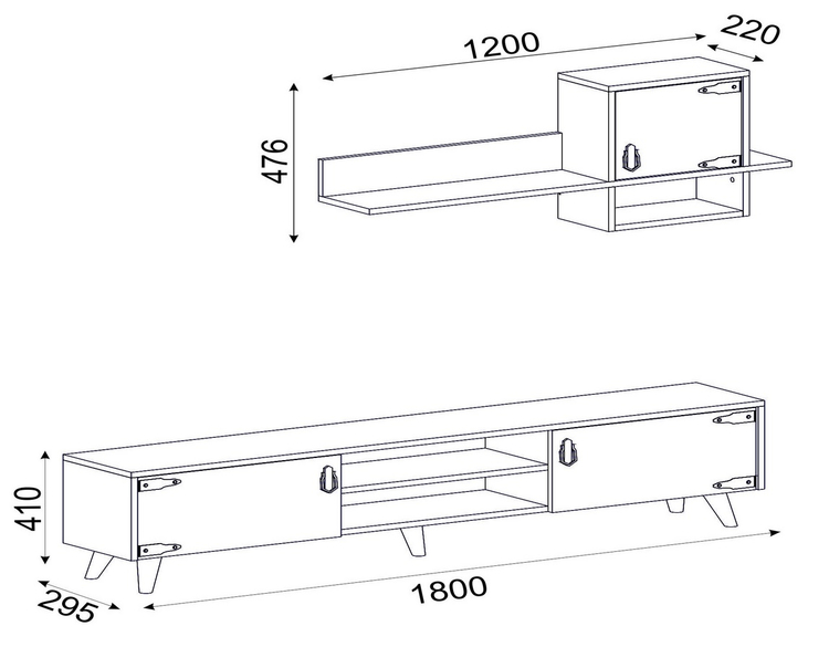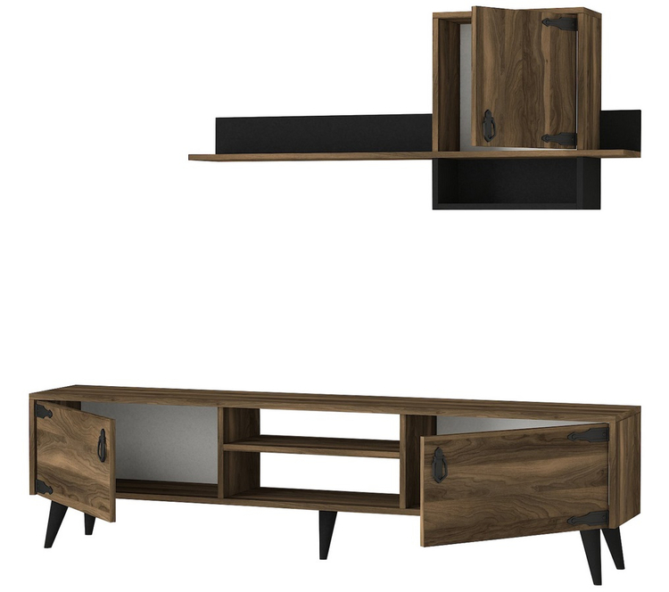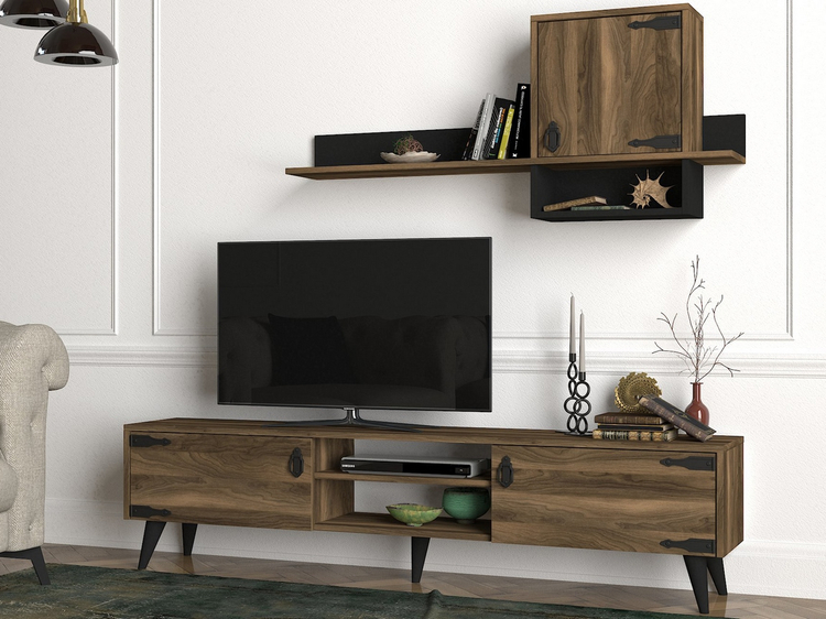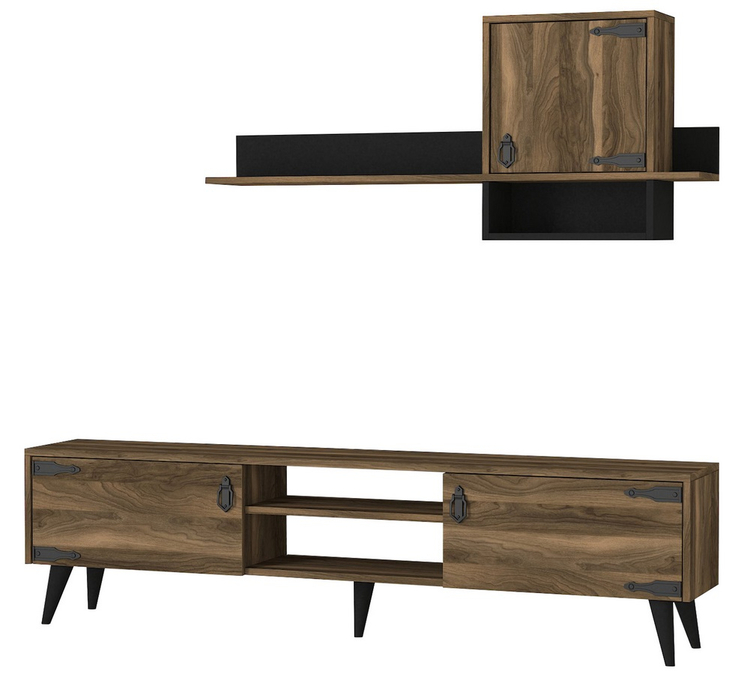 Televizní stolek s dvěma dvířky je vyroben z kvalitního lamina o tl.18 mm hraněné PVC páskou, odolného proti poškrábání v barvě vlašský ořech s kovovými prvky. Součástí balení je také závěsná skříňka s policí o rozměrech (Š x V x H cm) 120 × 47,6 × 22 cm. Dodáváme v demontovaném stavu.CASA 28006