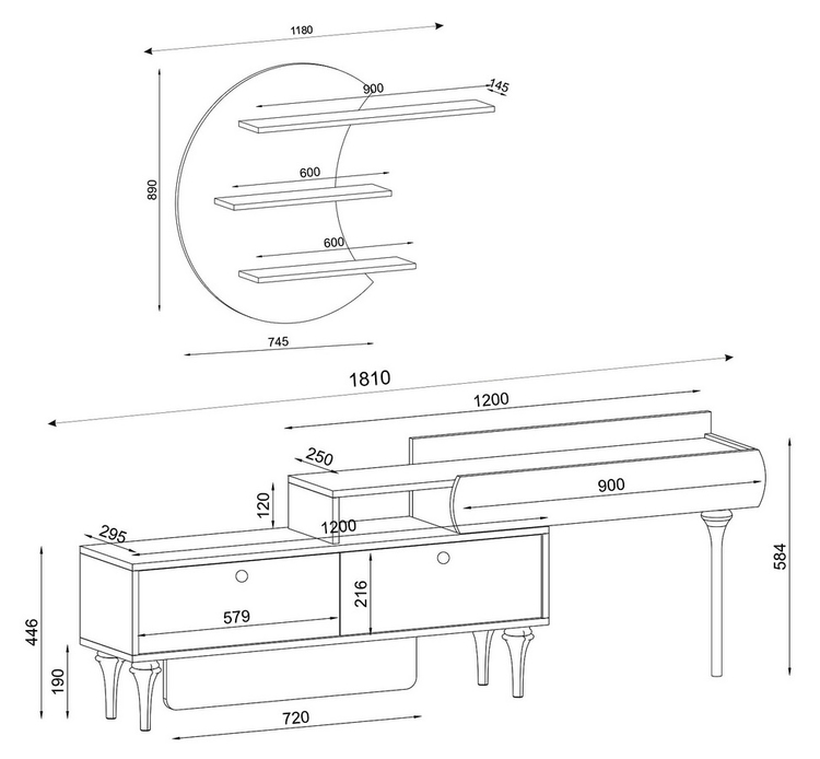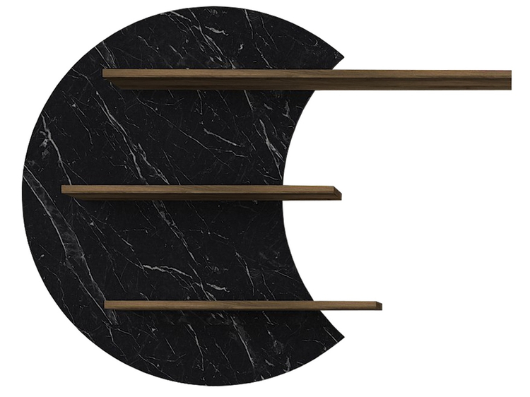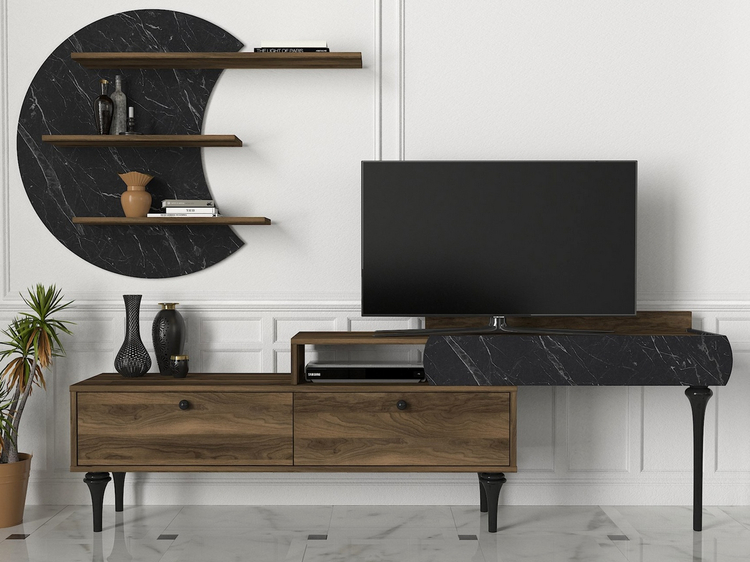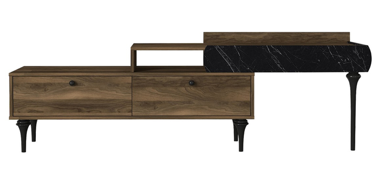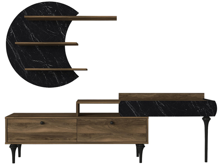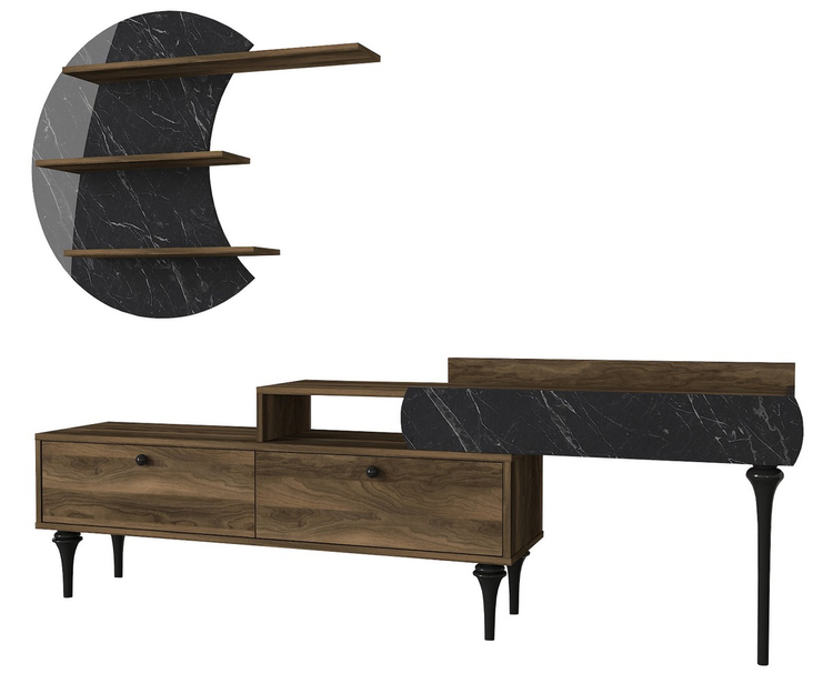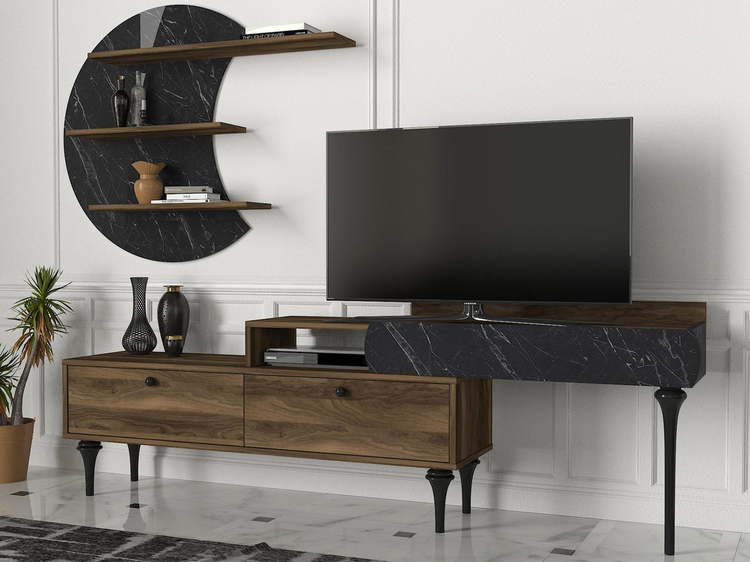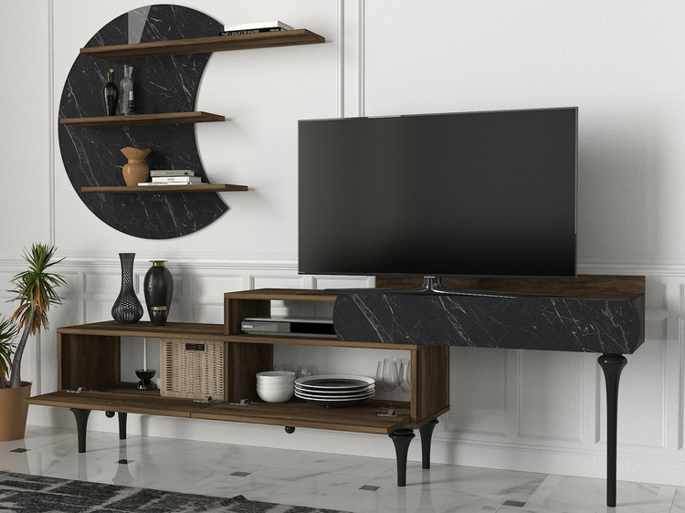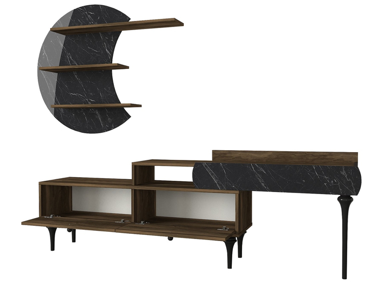 Televizní stolek se dvěma výklopnými dvířky je vyroben z kvalitního lamina o tl.18 mm hraněné PVC páskou, odolného proti poškrábání v kombinaci barev vlašský ořech/marble (černý mramor). Součástí balení je také panel s policemi o rozměrech (Š x V x H cm) 118 × 59 × 14,5 cm. Dodáváme v demontovaném stavu.CASA 28054