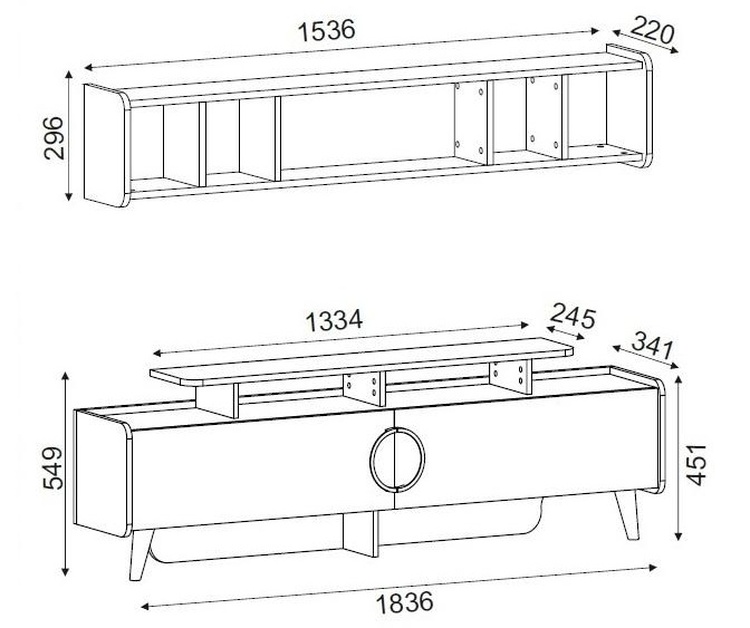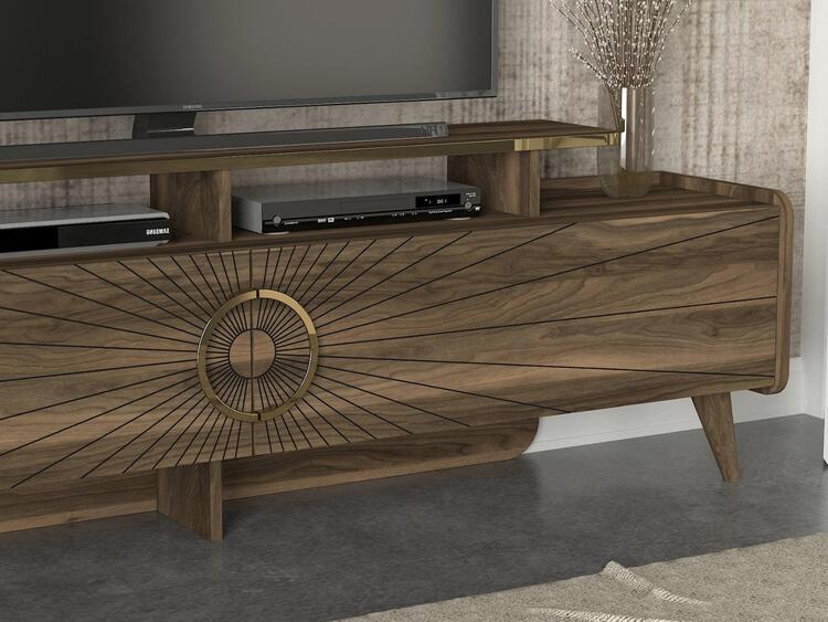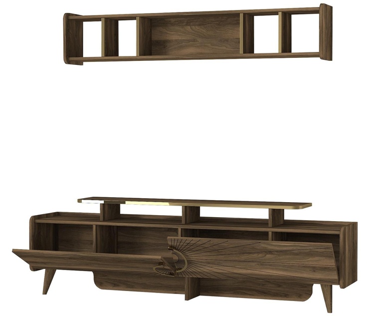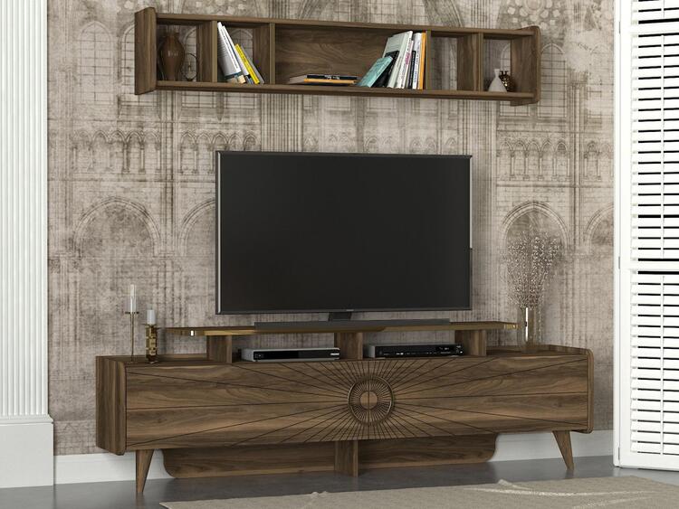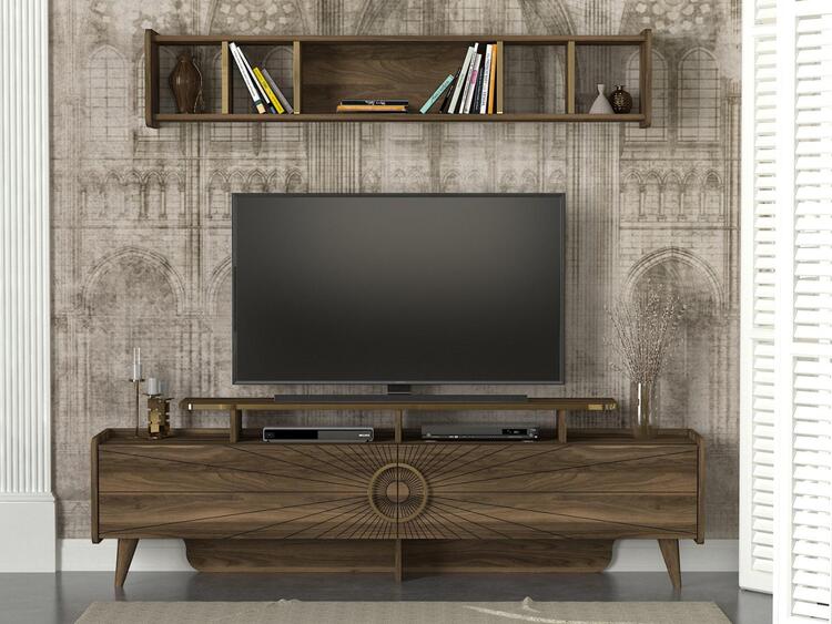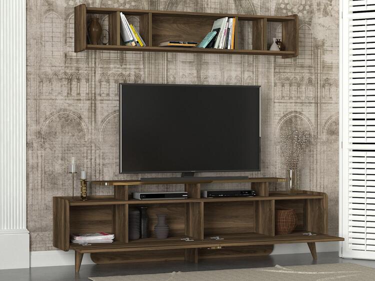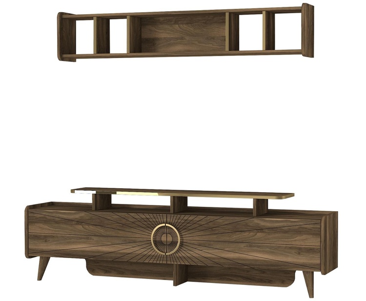 Televizní stolek s dvěma ozdobnými dvířky a praktickou policí je vyroben z kvalitního lamina o tl.18 mm hraněné PVC páskou, odolného proti poškrábání v barvě vlašský ořech. Součástí balení je také závěsný regál. Rozměry TV stolku: Šířka: 184 cm Výška: 55 cm Hloubka: 34 cm Rozměry nástěnné police:Šířka: 154 cm Výška: 30 cm Hloubka: 22 cm Dodáváme v demontovaném stavu.