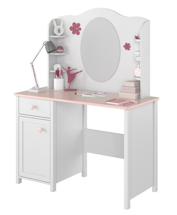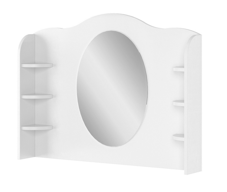 Toaletka se zrcadlem. Tento elegantní nábytek dodá romantickou atmosféru pokojíčku malé princezny i větší slečny. Nástavec je vyroben z desky LTD v barvě bílé. Nástavec je možné kombinovat s psacím stolem 03 nebo komodou 05, upevňuje se úchytkami v zadní části stolu (komody). Dodáváme v demontovaném stavu.CASA 73019
