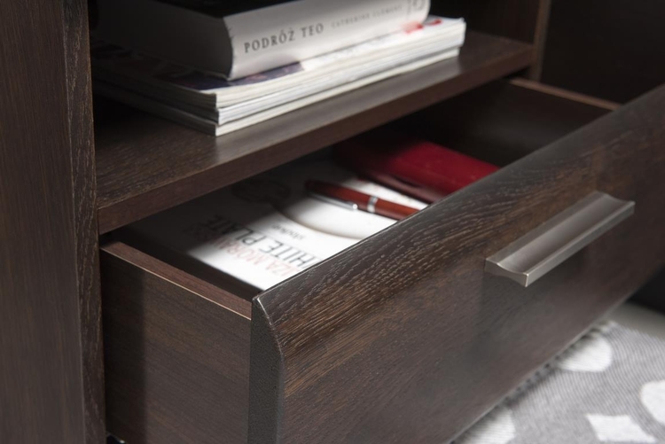 Toaletní stolek se zásuvkou ze sektorové řady PORTI značkového výrobce Szynaka. Systém PORTI je exkluzivní kolekce navržena v moderním duchu. Struktura ušlechtilého masivního dubu na přední straně a přírodní dýha na korpusu zdůrazňuje velmi klasickou barvu čokoládový dub. Opakující se prvek... více informací o zboží