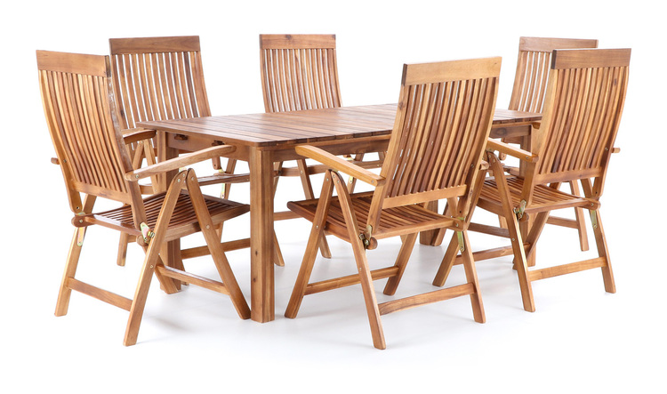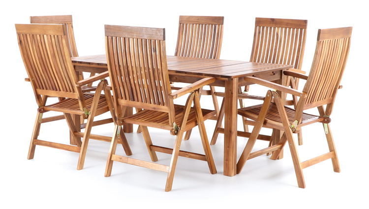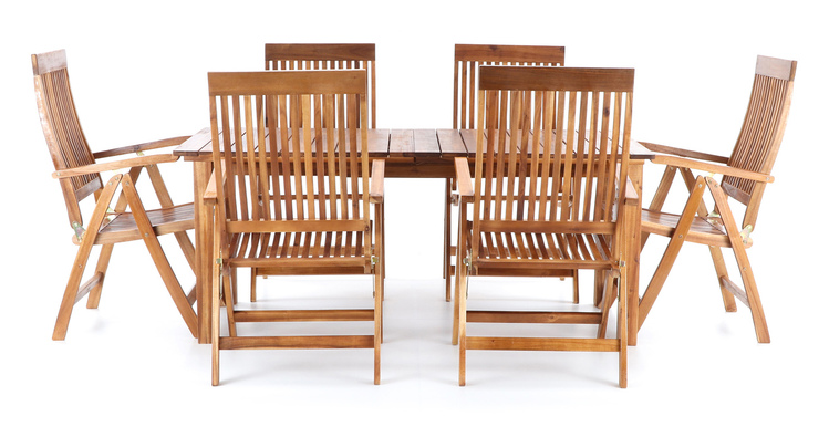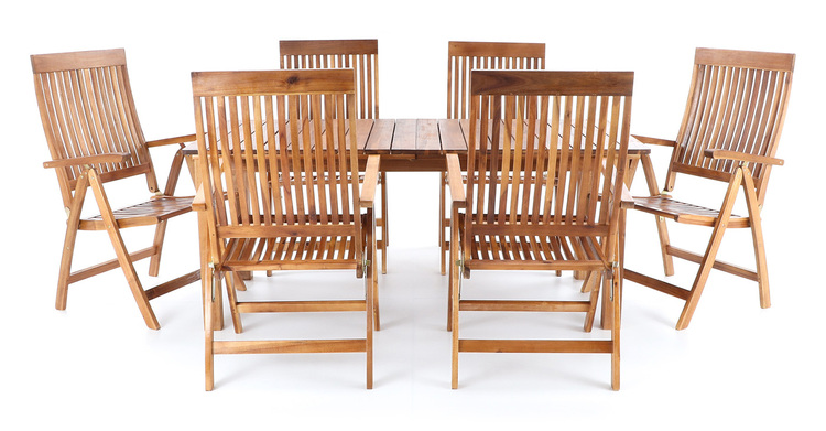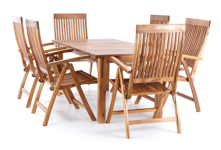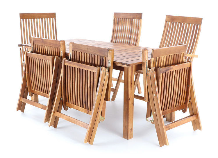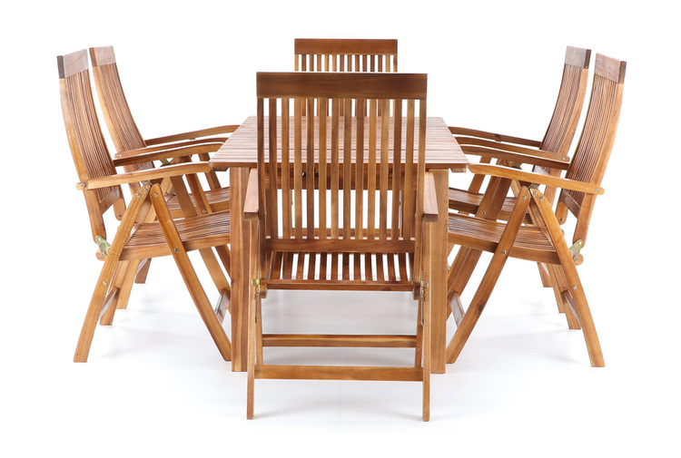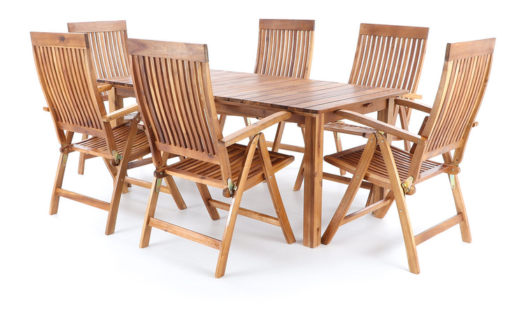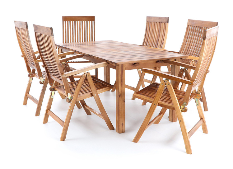 polohovatelných křesel a obdélníkovéhostoluz exotického, velice trvanlivého a tvrdého dřevaakácie.