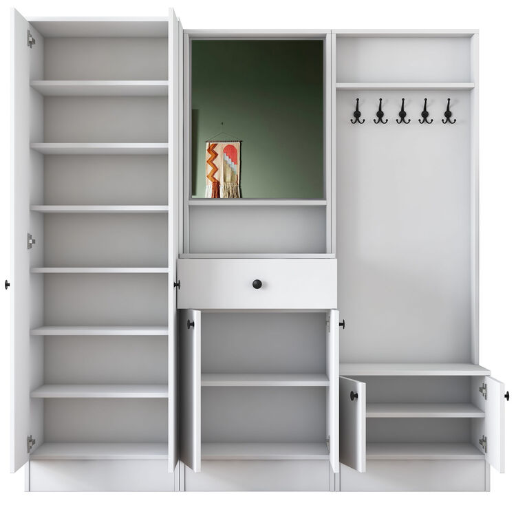 Předsíňová sestava přináší do vaší předsíně čistý a minimalistický design inspirovaný skandinávským stylem. Je navržena tak, aby zajistila praktickou organizaci prostoru a zároveň dodala interiéru moderní vzhled.