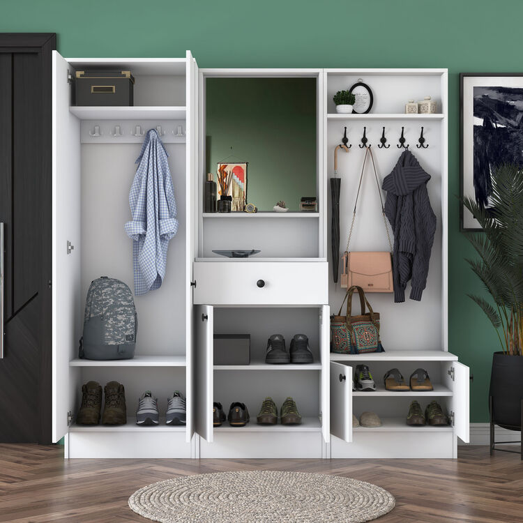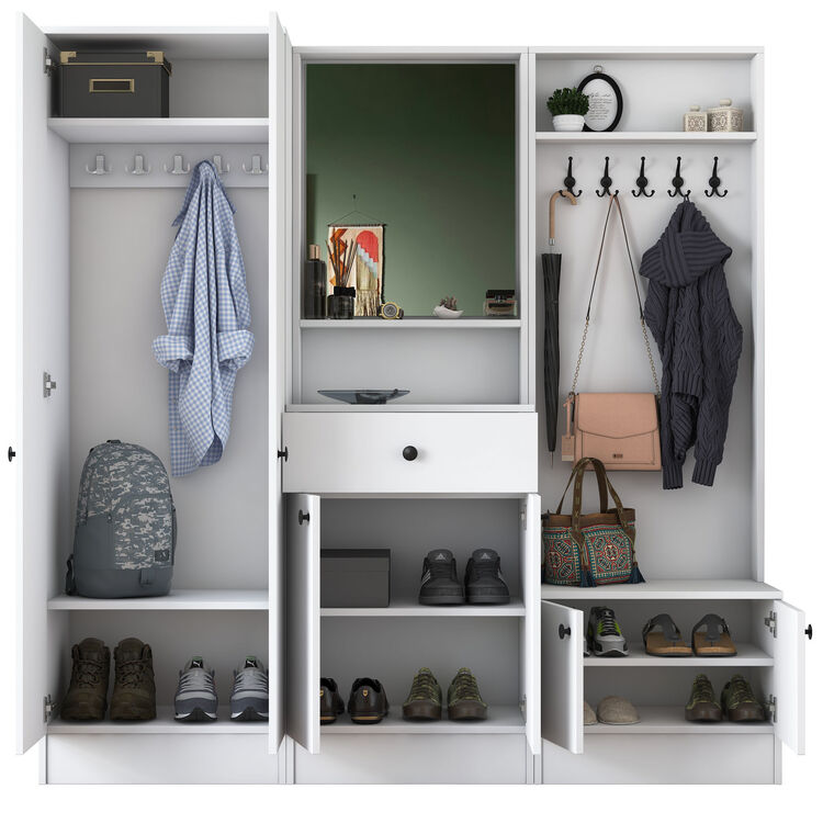 Předsíňová sestava je ideální volbou pro každou moderní předsíň. Díky čistě bílému provedení dodává prostoru svěží a elegantní vzhled. S promyšleným uspořádáním a dostatkem úložného prostoru pomáhá udržovat předsíň přehlednou a organizovanou.