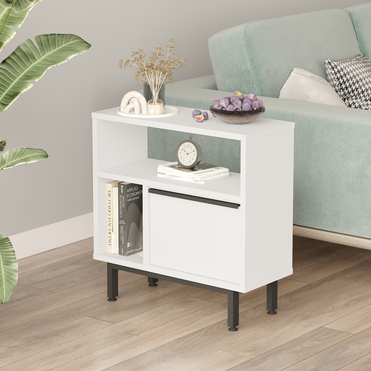 kombinuje praktické vlastnosti s moderním designem. Díky regálku můžete snadno odkládat knihy, časopisy nebo dekorace, zatímco plné dvířko skryje drobné předměty, které chcete mít po ruce, ale ne na očích. Tento stolek se hodí jak k sedačce, tak do rohu místnosti, kde poskytne praktické využití a elegantní vzhled.