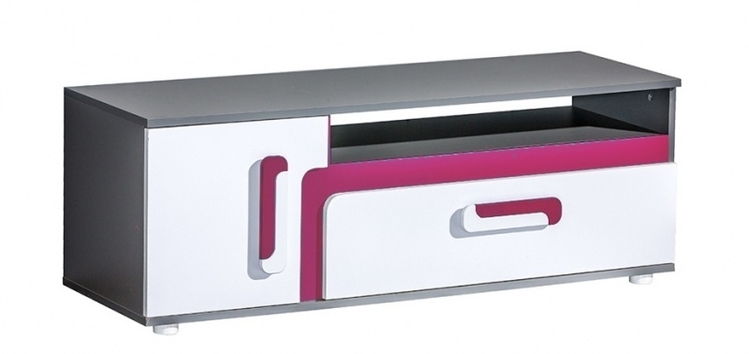 Televizní stolek APETTITA ze sektorové řady, která se vyznačuje netradičním zpracováním barev a originalitou úchytů. Tento styl nábytku zaujme každou mladší generaci. Nábytek je vyroben z kvalitní LTD desky hraněné ABS lištou. Korpus je v barvě šedá antracit, dvířka a čela zásuvek jsou bílé matné, doplňková barva je růžová. Úchytky jsou v barevné kombinaci růžová/bílá . Sektorový nábytek APETTITA má široký výběr prvků, který Vám zaručí sestavit si dětský nebo studentský pokoj, ložnici či kancelář podle svých potřeb, přání a představ. Dodáváme v demontovaném stavu.CASA 23001